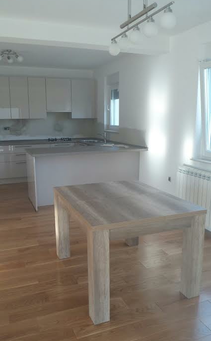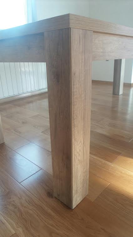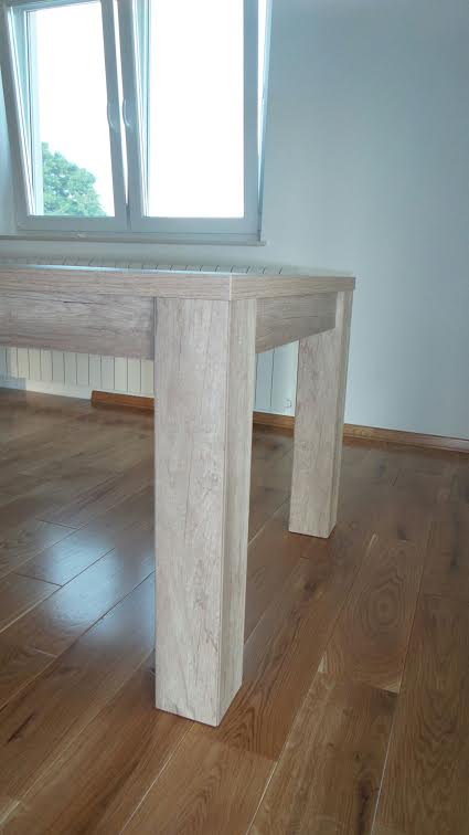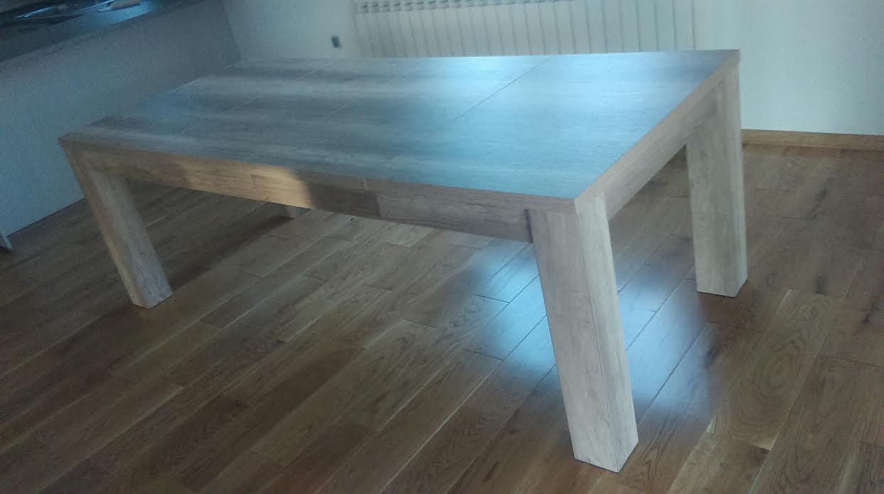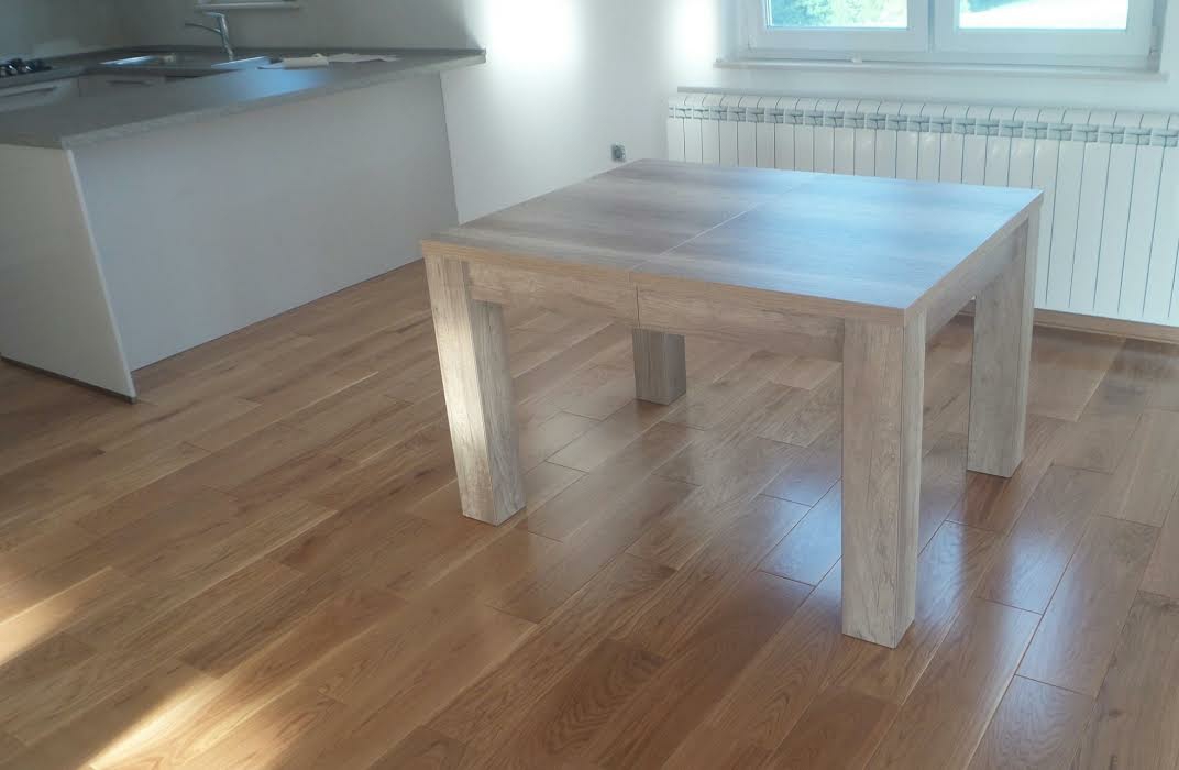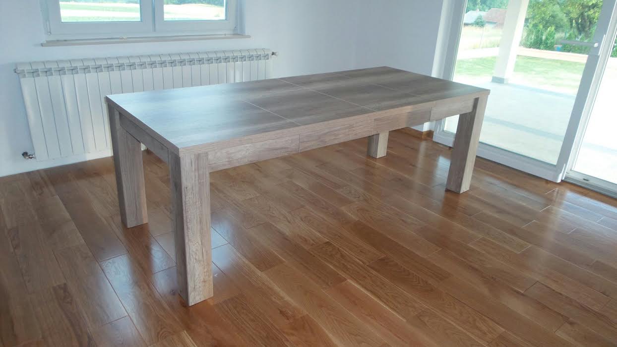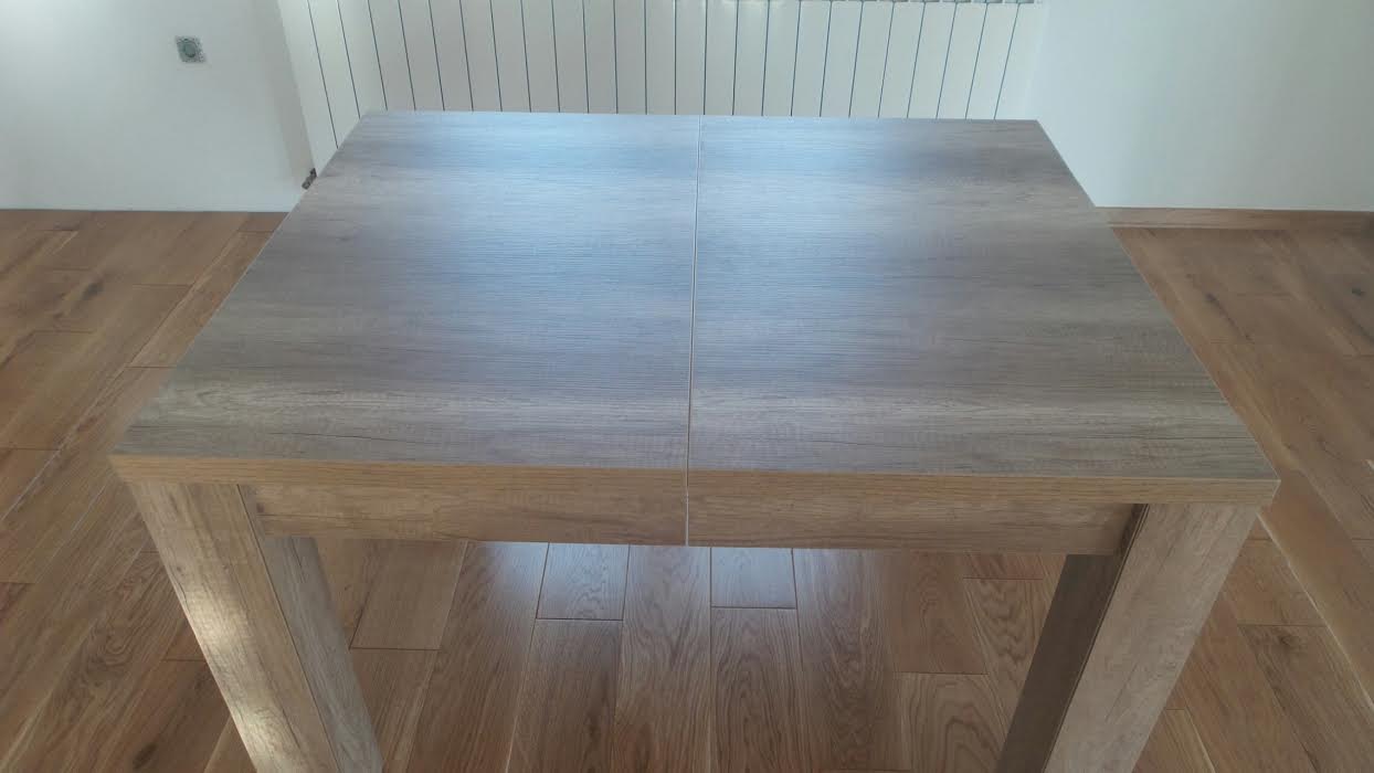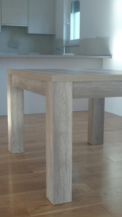 Blagovaonički stol na razvlačenje Ikan po mjeri u najmanjoj dužini je 1200 mm i širine 950 mm. Dodantne dvije ploče su dužine 500 mm te imaju "lažne" okvirnice kako bi se sakrila vodilica stola kada se stol razvuče na dužinu 1700 mm sa jednom dodatnom pločom ili na 2200 mm sa dvije dodatne ploče. Zbog okvirnica na dodatnim pločama one se ne mogu spremiti unutar stola, već na Vama odgovarajuće mjesto. Ploče stola su debljine 36 mm, a noge stola su u obliku kvadrata punom debljinom od iverala spajanog sa kosinama na bridovima. Iveral hrast Canyon svojim pastelnim i pješčanim nijansama nadovezuje se na boju moderne kuhinje po mjeri, a svojim razigranim godovima daje interijeru toplinu.