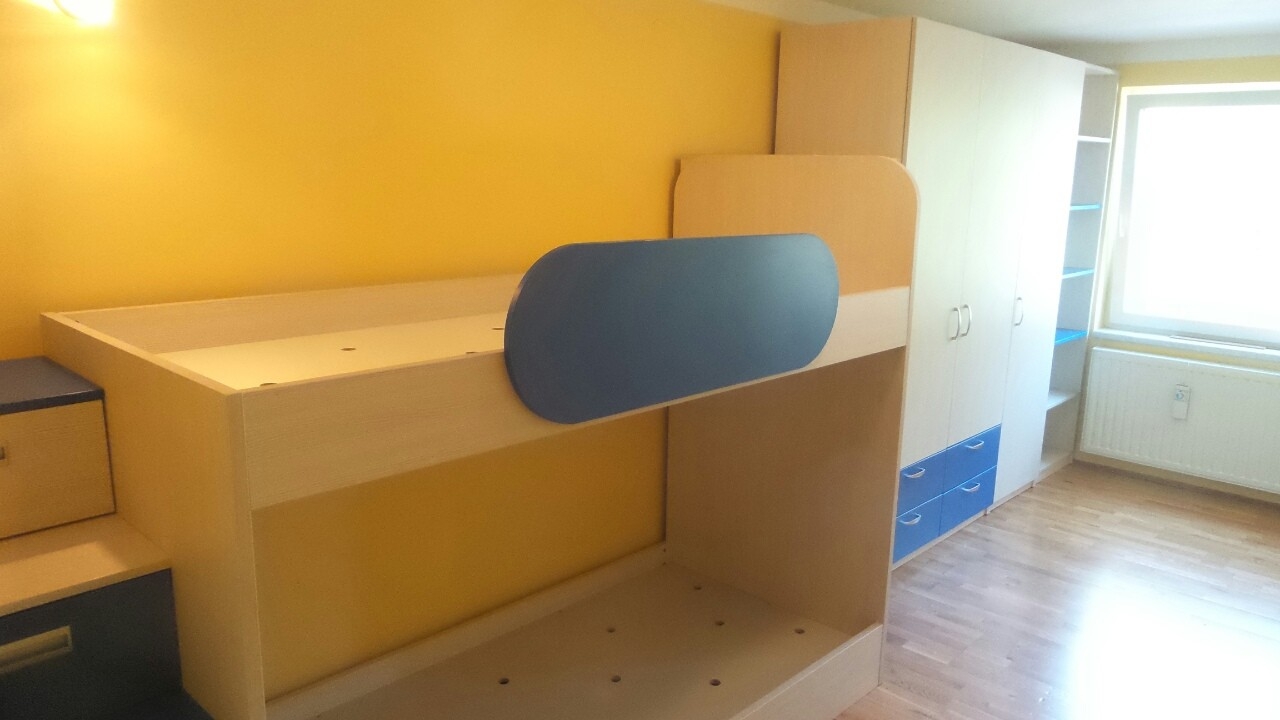Projektirajući namještaj za ovu dječju sobu bilo je potrebno osmisliti krevet na kat sa stepenicama, garderobne ormare, te radni stol. Stepenice smo smjestili uza zid kako bi se predškolska i školska djeca mogla bezbrižno popeti na gornji krevet. Stepenice smo iskoristili ubacivši ladice, a ormar do kreveta spustili na visinu uzglavlja kako bi njegov strop poslužio i kao polica za odlaganje raznih stvarčica koje djeca vole imati uza se kada idu na spavanje. Taj ormar smo iskoristili za ladice i otvorene police kako bi razne igračke i knjige bile pri ruci. Ostale garderobne ormare nadovezali smo po dužini prostorije, a u izdvojenom kutu smjestili smo radne stolove koji se ubuduće mogu izdvojiti i premjestiti ako bude potrebno.
