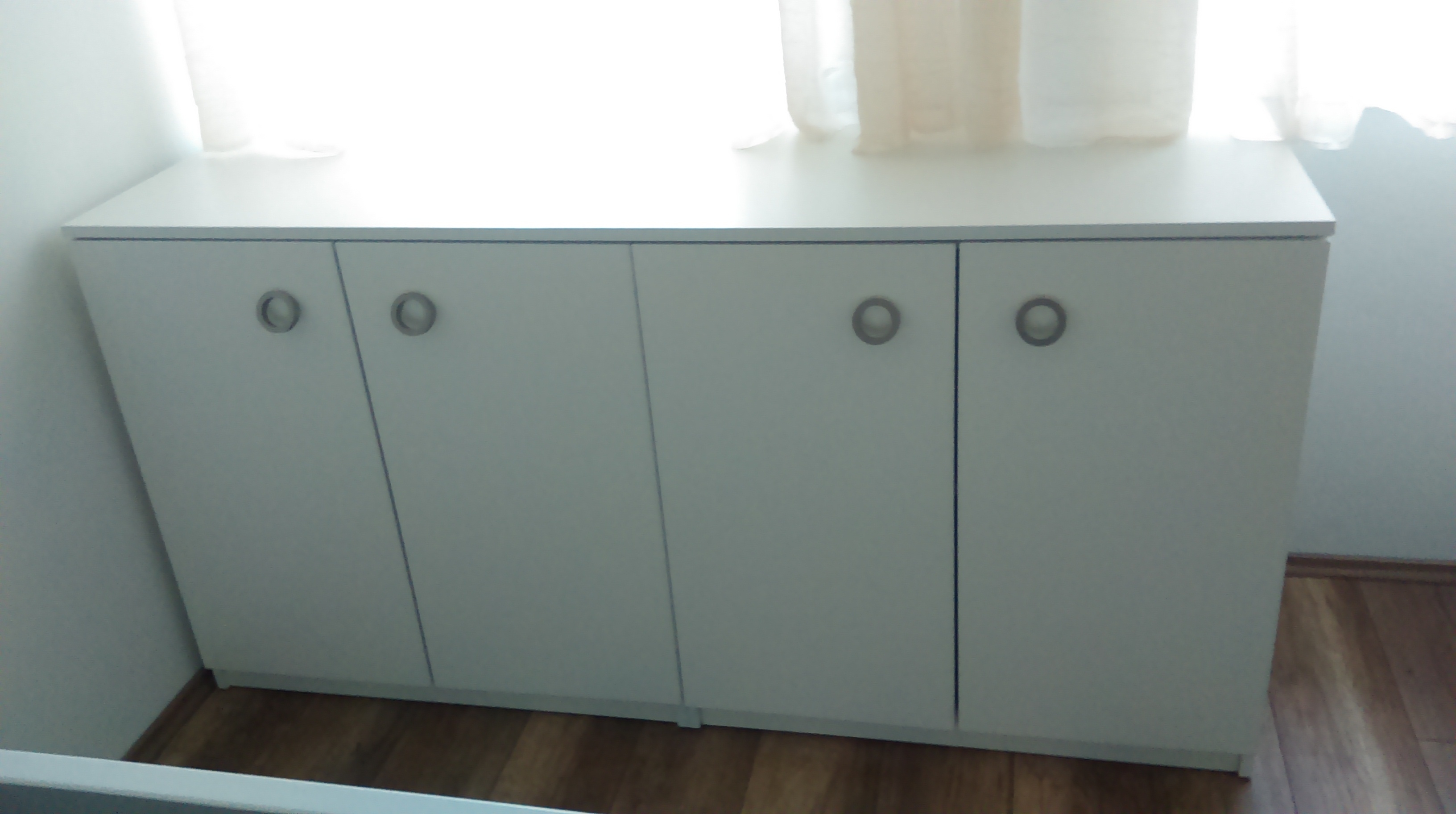 Komodu po mjeri za spavaću sobu čine dva elementa sa policama i zajedničkom pokrovnom pločom. Komoda po mjeri kao i ugradbeni ormar sa kliznim vratima izrađeni su od iverala bijeli Rustik tj. bijeli mat iveral sa teksturom gustog goda. Metalne ručkice na frontama komode po mjeri su u obliku prstena i zanimljiv detalj na samoj komodi.