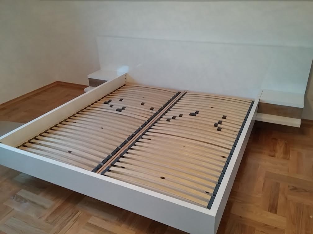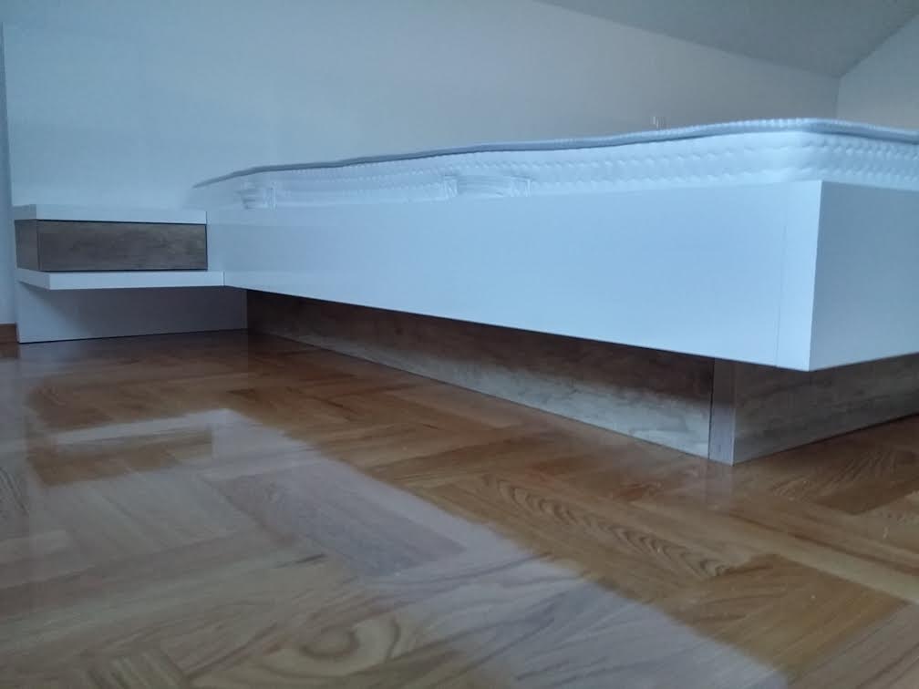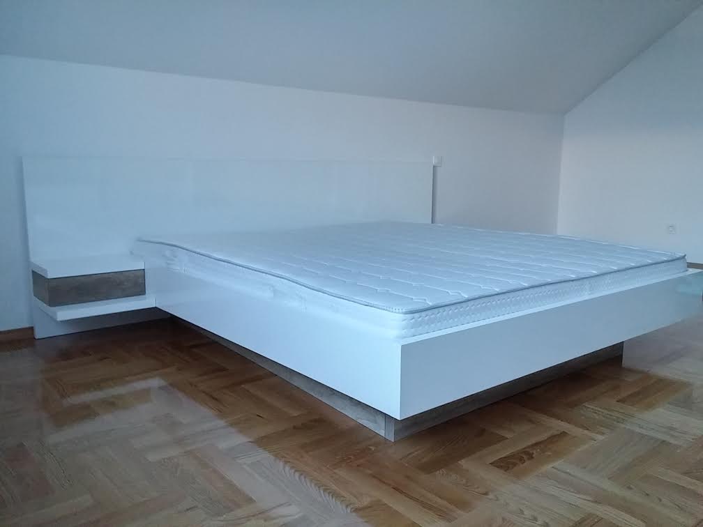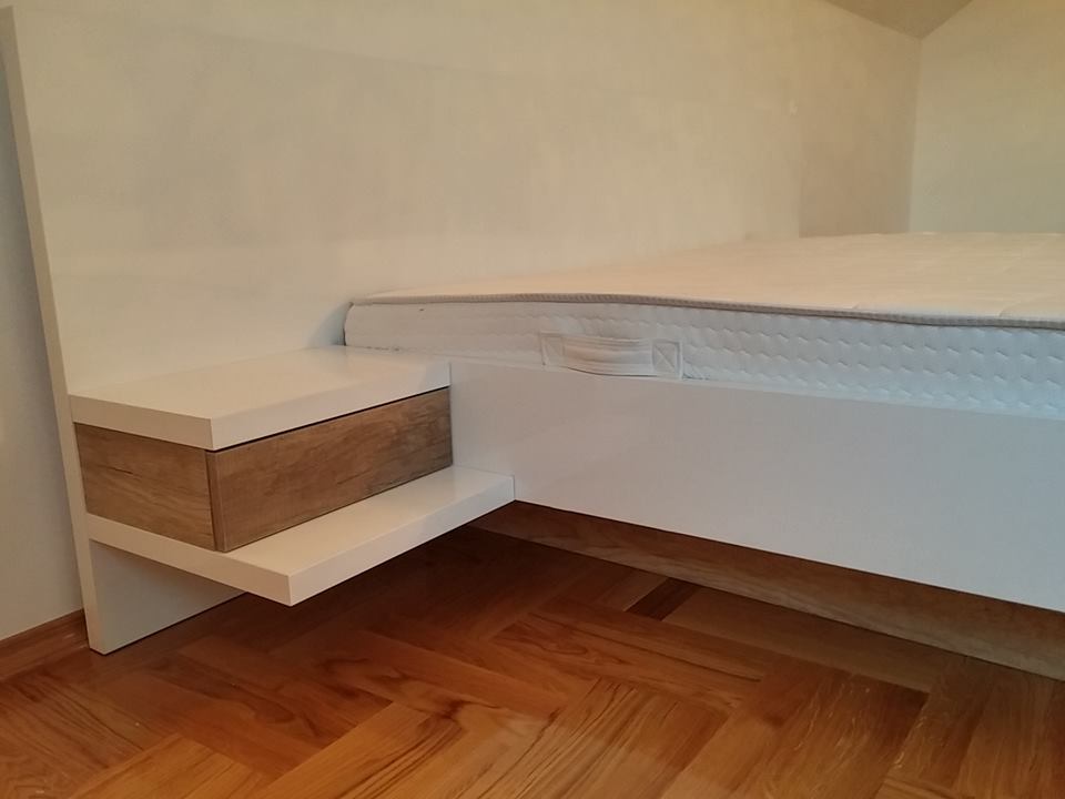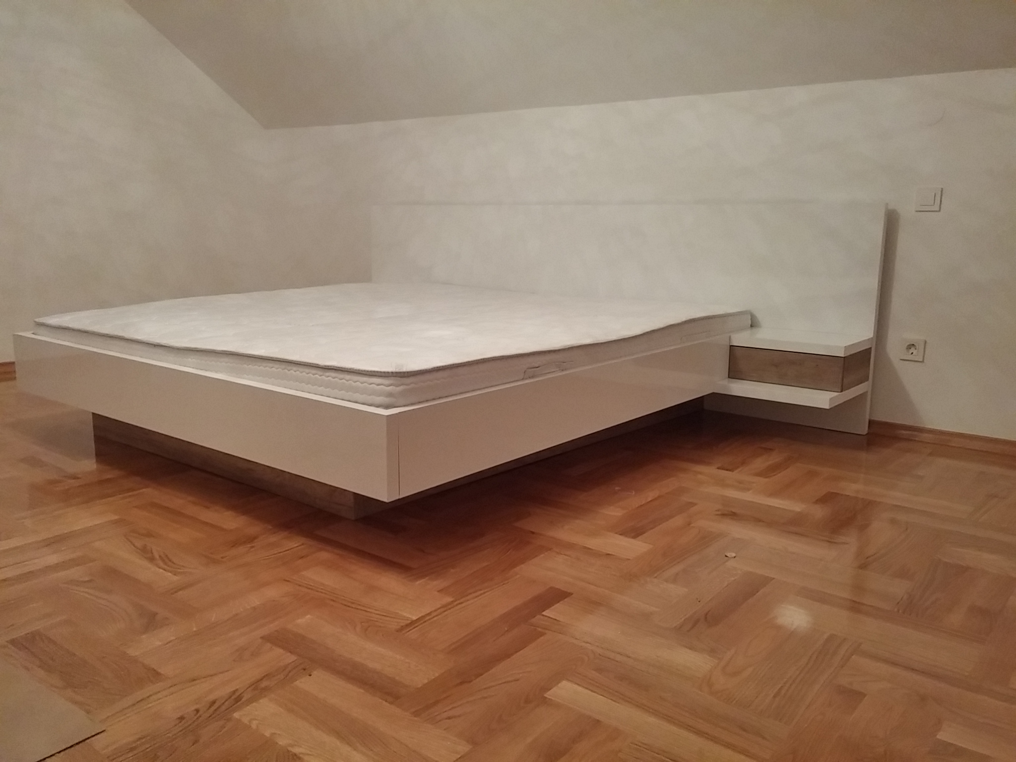 Dizajnirali smo namještaj po mjeri za spavaću sobu kako bi namještaj po mjeri bio jedinstven, kvalitetan i prilagođen prostoru. "Lebdeći" krevet po mjeri s jednostavnim detaljima ladica i polica na uzglavlju, ima uvučeni donji dio kreveta što daje dojam da je krevet dignut od poda, a ujedno ne udaramo nogama u stranice kreveta kada mu se približimo. Debljina okvira kreveta po mjeri kao i polica na uzglavlju je 36 mm. Iveral bijeli visoki sjaj naglasio je linije kreveta, a detalji iverala hrast Canyon čine ga "prozračnijim".
