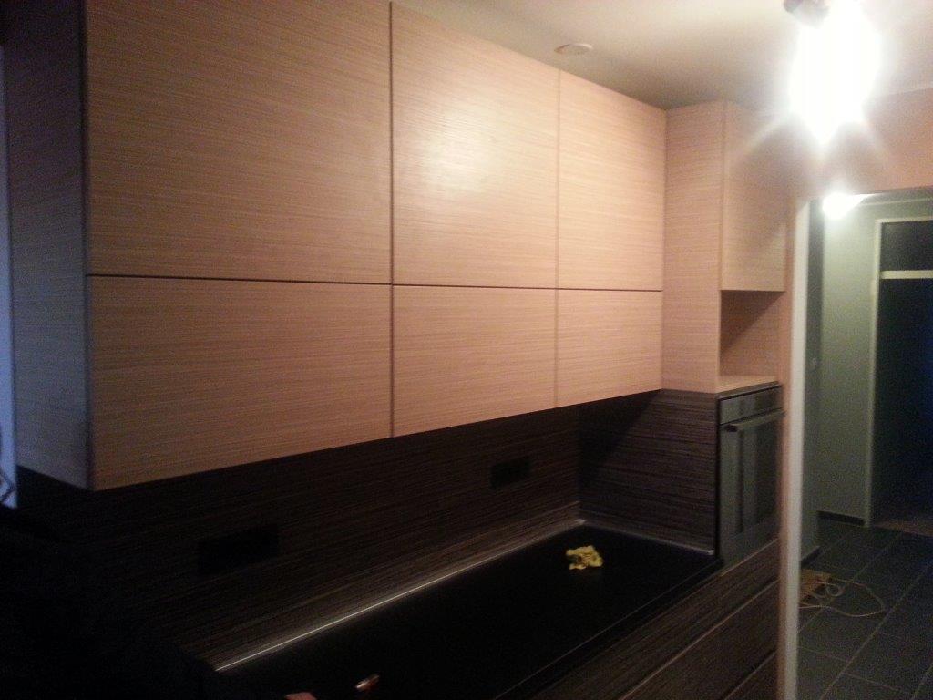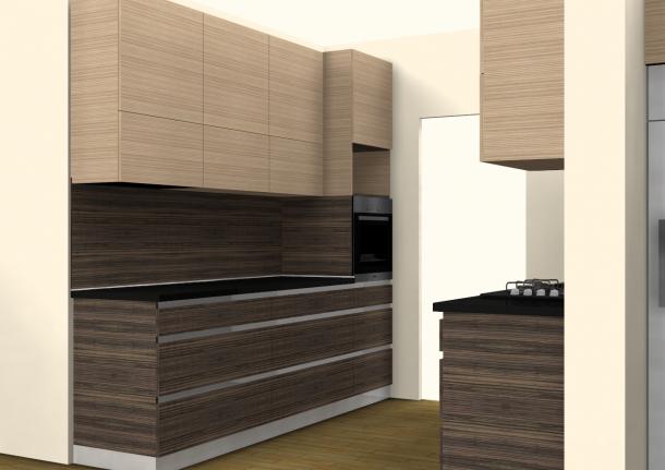 Kuhinja na dva suprotna zida u kombinaciji iverala drvnog dekora zebrano i zebrano svijetli sa crnom sjajnom radnom pločom. Zidna obloga između donjih i gornjih elemenata je od iverala debljine 10 mm drvnog dekora zebrano. Kuhinju ćine kuhinjski elementi donji: element za sudoper, četiri elementa od tri ladice sa samouvlačnim vodilicama, te visoki element u dva dijela (kako bi linija dva dekora bila potpuna) koji u donjem dijelu ima tri ladice i ugradbenu pećnicu, a gornji dio je predviđen za mikovalnu pećnicu iznad koje je ormarić sa policom. Gornji elementi su visoki (do stropa), te su podijeljeni na donji dio sa podiznim vratima i gornji sa klasičnim zaokretnim otvaranjem na pritisak. Ladice se otvaraju pomoću profilnih aluminijskih ručkica koje naglašavaju njihove linije dužinom cijele kuhinje. Hladnjak, ledenica i izvlačna kolona sastavljna od ladica sa samouvlačnim vodilicama nalaze se u niši pokraj desnog zida.