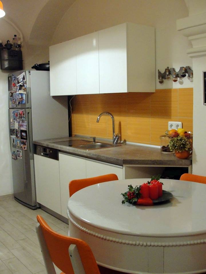 Kuhinja po mjeri sa frontama iveral bijeli mat drvni god i profilnim nasadnim aluminijskim ručkicama. Kuhinja na dva suprotna zida podijeljena je na dio za pripremu i dio za kuhanje.