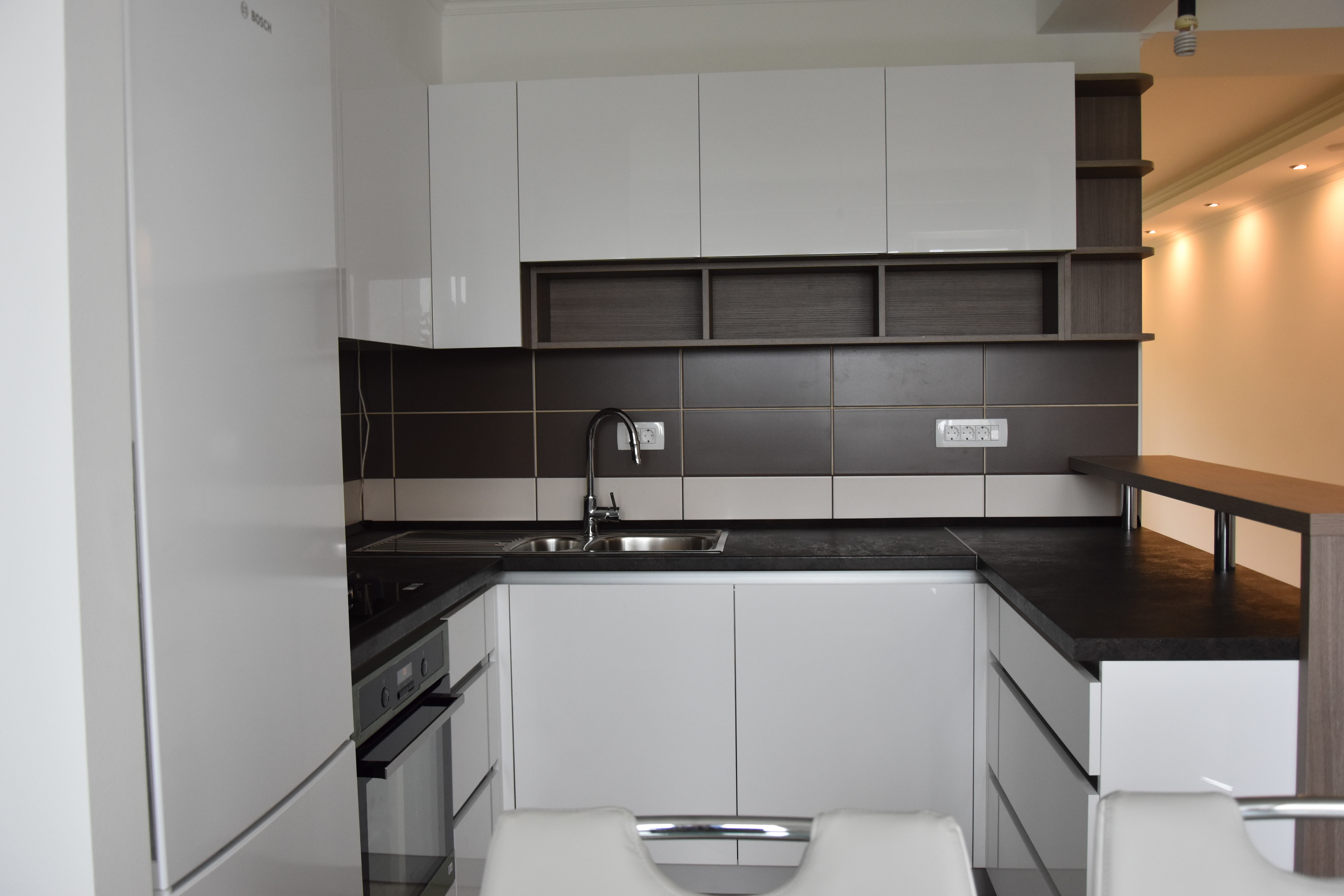 Dizajn kuhinje po mjeri sa profilnim aluminijskim ručkicama i šankom