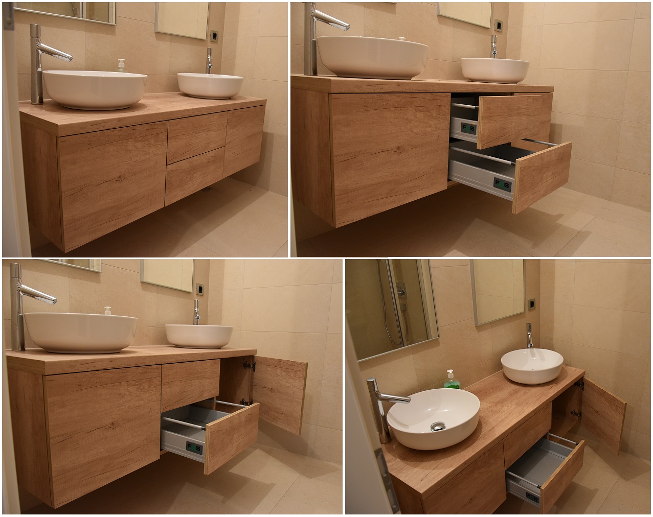 Element za nasadni umivaonik ima dvije samouvlačne ladice za razne sitne stvari, a sa svake strane je dio za deterdžente ili ručnike. Tip - on ladice i fronte elementa odlično su rješenje kada želimo izbjeći ručkice koje bi nam pri svakodnevnoj upotrebi smetale, a ujedno nismo narušili rustikalni dekor hrasta. Drvni dekor kupaoničkog elementa uz keramiku imitacije kamena čini kupaonicu ekskluzivnom wellness oazom.