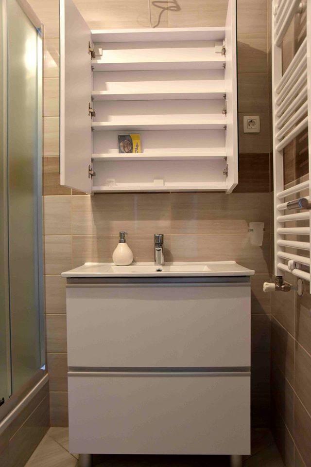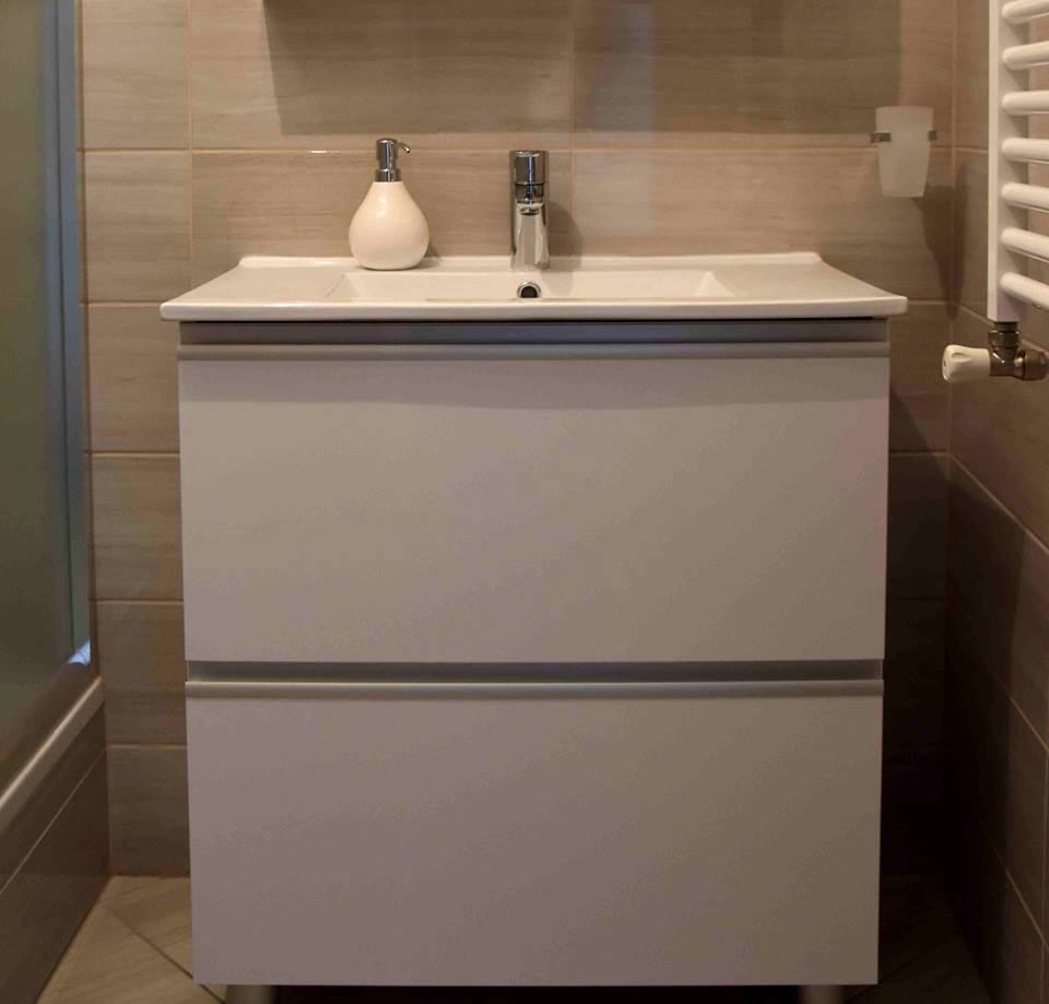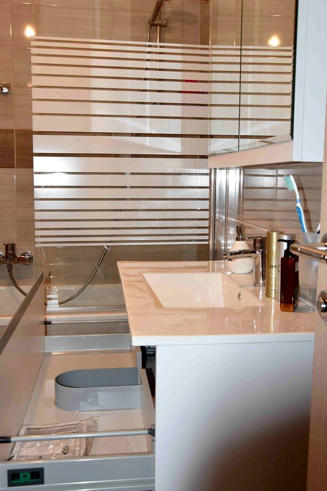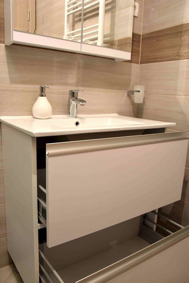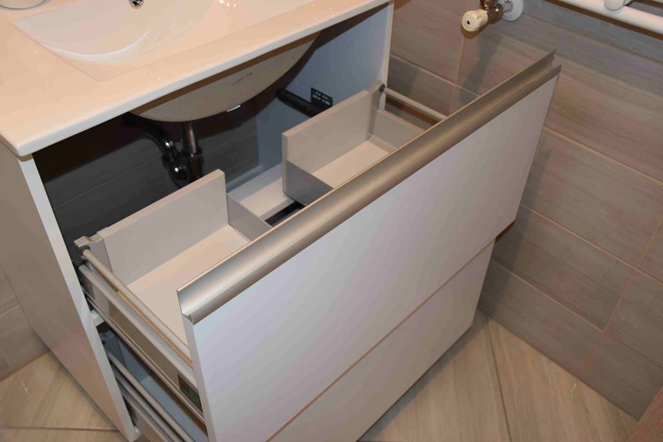 Element za nasadni umivaonik ima dvije samouvlačne ladice u koje se mogu spremiti sredstva za čišćenje, deterdženti ili ručnici. Kako bi element s ručkicama bio u jednoj ravnini postavili smo aluminijske nasadne ručkice po cijeloj širini fronte koje su ujedno i zaštita fronte od zaostajale vode.