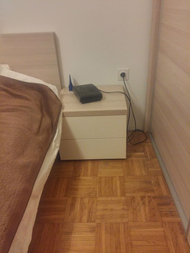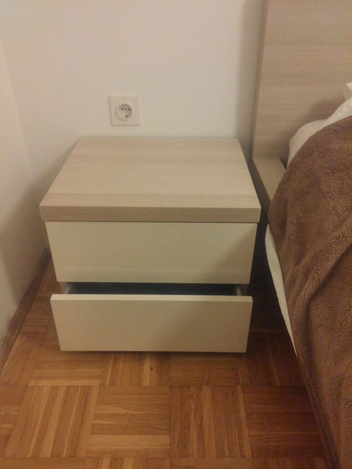 Ugradbeni ormar po mjeri za spavaću sobu maksimalno je iskoristio prostor za garderobu. Kako bi uskladili dekor okvira postojećeg kreveta sa ugradbenim ormarom po mjeri i noćnim ormarićima po mjeri odabrali smo iveral Coimbra. Korpus ormara također smo radili od iverala Coimbra što je garderobni ormar učinilo ekskluzivnijim. Kako bi razbili monotoniju jednog dekora u cijeloj spavaćoj sobi, a ujedno i otvorili malen prostor, uklade na kliznim vratima kombinirali smo sa iveralom visoki sjaj slonova kost. Unutrašnjost ugradbenog ormara po mjeri u spavaćoj sobi podijeljena je na nisko vješanje u dvije visine, te kombinaciju polica i ladica. Uz ugradbeni garderobni ormar postavili smo i noćne ormariće po mjeri gdje smo također kombinirali iveral Coimbru i iveral visoki sjaj slonova kost. Strop elementa je u debljini 36 mm kao što je i uzglavlje kreveta, a ladice na noćnom ormariću se otvaraju pritiskom fronte. Kako je klijentima bio potreban i radni stol koji su mogli smjestiti jedinu u interijeru spavaće sobe, osmišljeno je rješenje izgleda radnog stola po mjeri sa policama za spremanje dokumenata, kompjutor, te ostale potrebne uređaje.