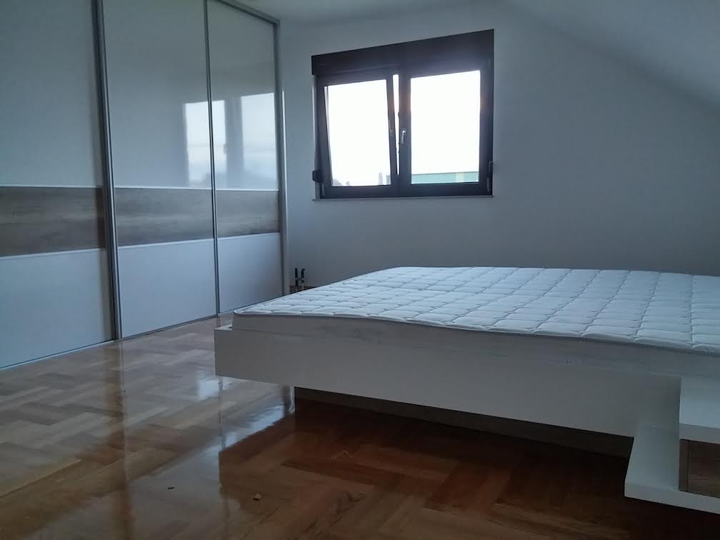Dizajn namještaja po mjeri za spavaću sobu daje Vam mogućnost uređenja interijera prema Vašim željama i našim prijedlozima. Namještaj za spavaću sobu dizajniran za Vas učinit će Vaš interijer jedinstvenim, a ujedno i prilagođen dimenzijama prostora. Time maksimalno iskorištavate prostor, a izborom i kombinacijom dekora iverala naglašavate detalje dizajniranog namještaja po mjeri koji čine lijepu sliku Vašeg prostora. Krevet po mjeri sa zanimljivim i jednostavnim detaljima ladica na uzglavlju, te uvučenog donjeg dijela kreveta koji daje dojam lebdećeg kreveta ćine ga jedinstvenim. Garderobni ormar vidljiv je s obje bočne strane, međutim kako ide do stropa sastavljen je od elemenata od iverala bijelog mat, dok su bočne maske od iverala bijeli visoki sjaj kao i uklade na kliznim vratima. Time smo prikrili spoj elemenata, te postavili graničnik za klizna vrata po mjeri. Klizna vrata na ugradbenom ormaru po mjeri podijelili samo na nejednake visine uklada kako bi vizualno smanjili ormar, a ujedno smo pratili visinu uzglavlja kreveta.