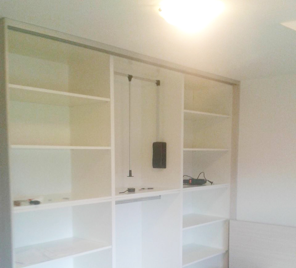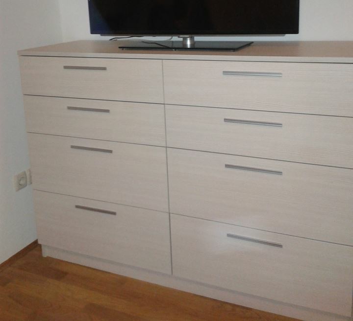 Spavaću sobu po mjeri opremili smo namještajem po mjeri dizajniranim posebno za taj prostor. S obzirom da se radi o potkrovlju bilo je potrebno najbolje iskoristiti prostor, stoga smo radili ugradbeni ormar po mjeri s vidljivom jednom bočnom stranom dok je druga strana do zida. Ugradbeni ormar po mjeri sastavljen je od nekoliko elemenata sa policama, vješanjem i garderobnim liftom. Klizna vrata sa jednim poljem rađena su od iverala bor Arden svijetli, kao i bočne maske. Uz ugradbeni ormar na jednom zidu dodali smo uz kosinu na drugom zidu samostojeći garderobni ormar sa policama, također od iverala bor Arden svijetli, dok smo ispod kosine smjestili komodu po mjeri u kombinaciji plitkih i dubokih ladica u istom dekoru. Ispod same kosine smješten je krevet po mjeri od iverala bor Arden svijetli debljine 25 mm. S obzirom da je krevet smješten do zida s desne strane, na lijevoj strani uzglavlja smo postavili dvije police različitih dubina. Postolje kreveta smo uvukli kako bi postigli vizualno prozračnost kreveta i spavaće sobe, a ujedno ne udaramo stopalima u stranice kreveta.