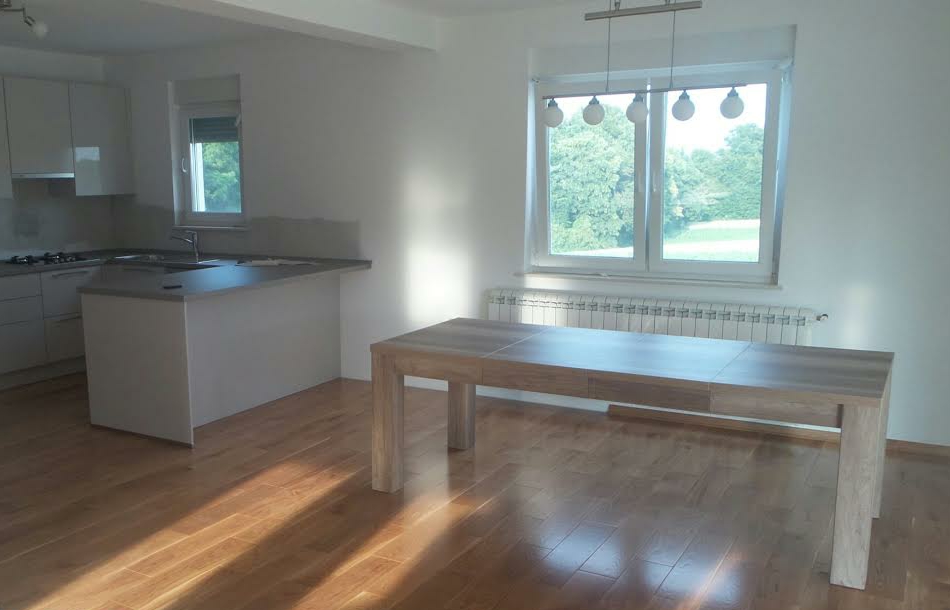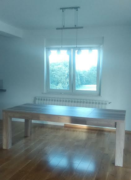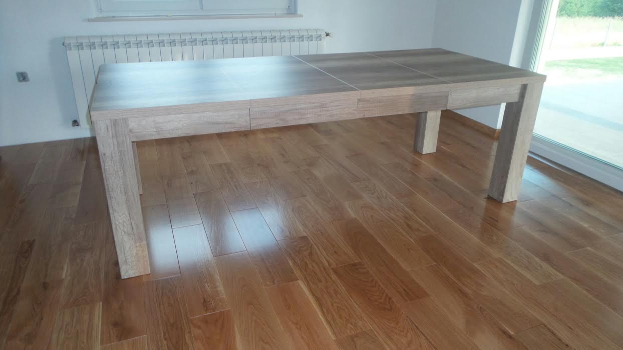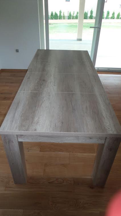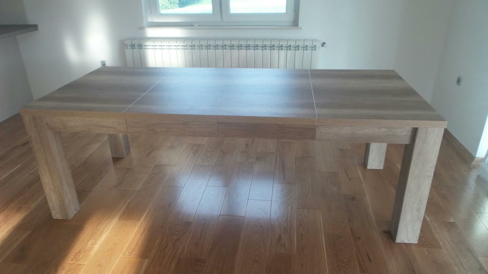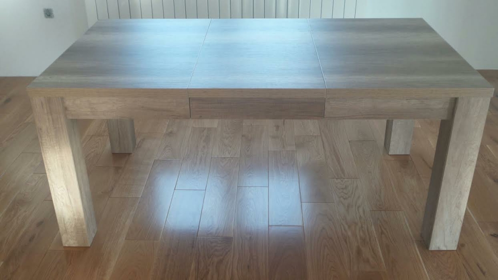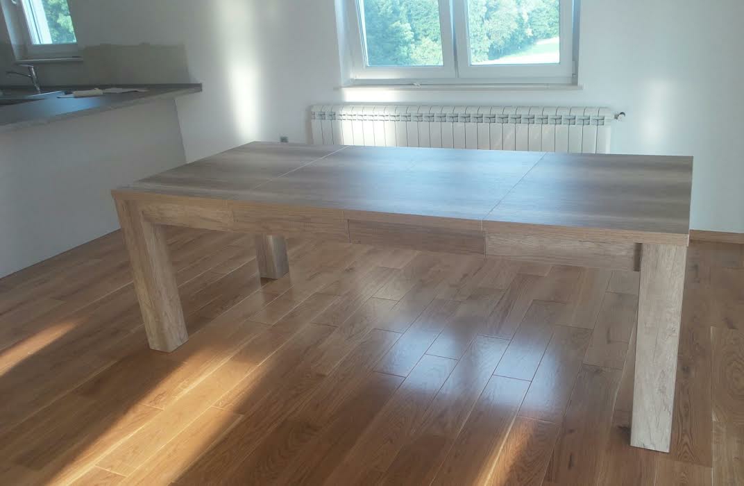 Blagovaonički stol na razvlačenje Ikan po mjeri u najmanjoj dužini je 1200 mm i širine 950 mm. Dodantne dvije ploče su dužine 500 mm te imaju "lažne" okvirnice kako bi se sakrila vodilica stola kada se stol razvuče na dužinu 1700 mm sa jednom dodatnom pločom ili na 2200 mm sa dvije dodatne ploče. Zbog okvirnica na dodatnim pločama one se ne mogu spremiti unutar stola, već na Vama odgovarajuće mjesto. Ploče stola su debljine 36 mm, a noge stola su u obliku kvadrata punom debljinom od iverala spajanog sa kosinama na bridovima. Iveral hrast Canyon svojim pastelnim i pješčanim nijansama nadovezuje se na boju moderne kuhinje po mjeri, a svojim razigranim godovima daje interijeru toplinu.