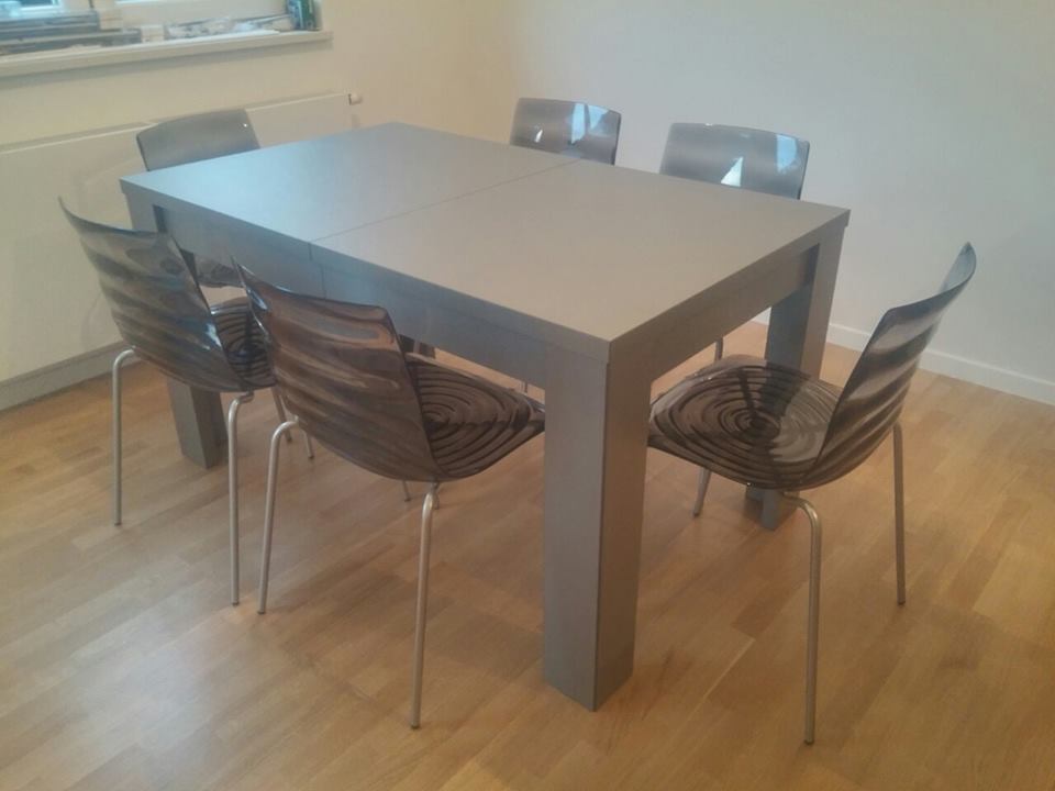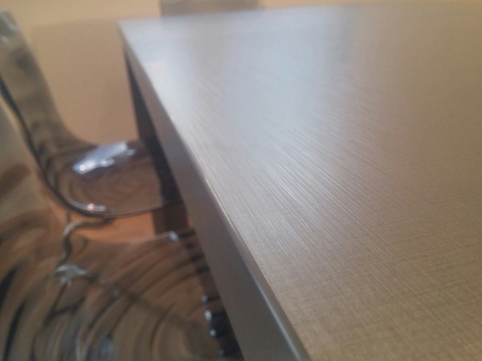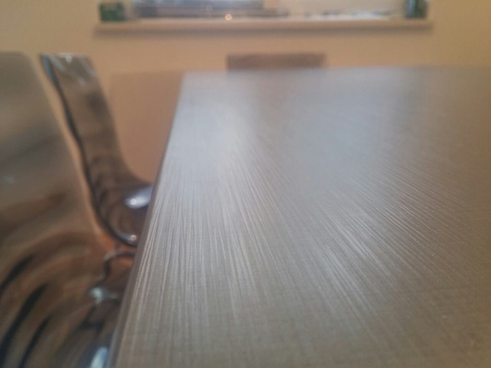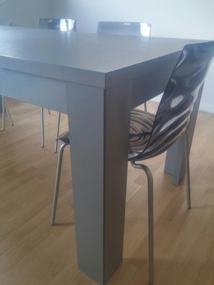 Blagovaonički stol na razvlačenje Kala po mjeri u najmanjoj dužini je 1400 mm i širine 850 mm. Dodatna ploča je dužine 500 mm, pa kada se stol razvuče ukupne je dužine 1900 mm. Dodatna ploča se sprema unutar stola. Ploče stola su debljine 36 mm, a noge stola su u obliku slova "L". Iveral Twist platinasti tekstil svojom teksturom i nijansama nadovezuje se na moderni stil stolica za blagovaonicu i kuhinju po mjeri.