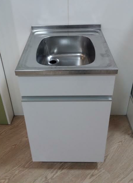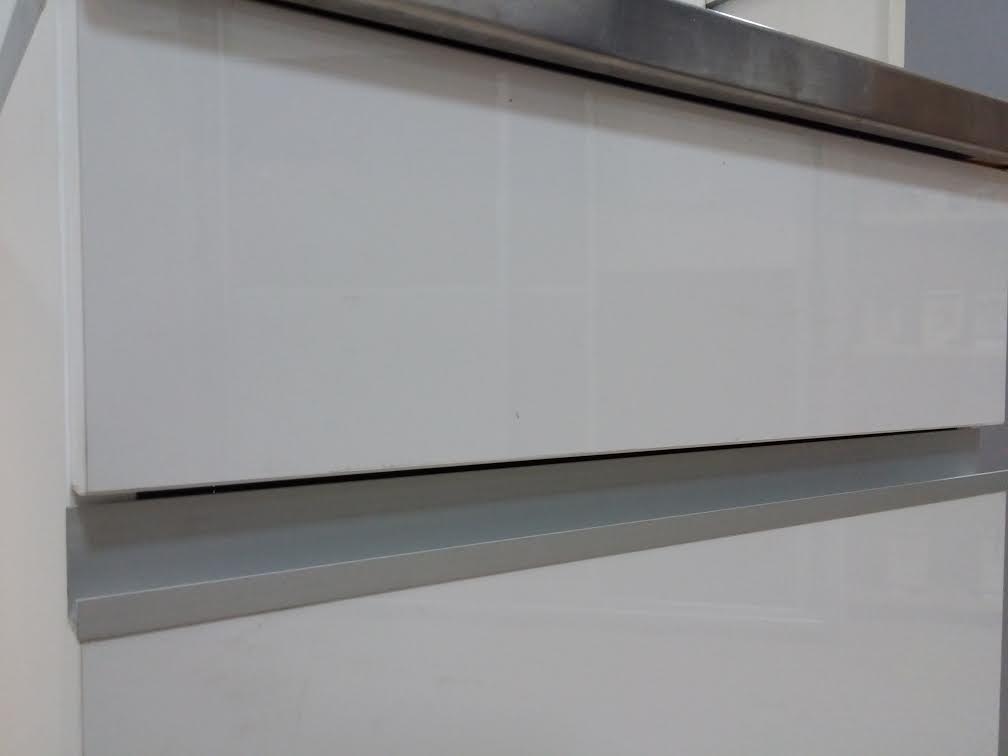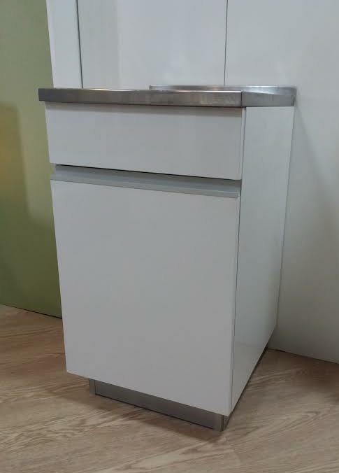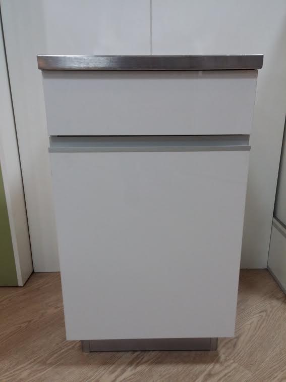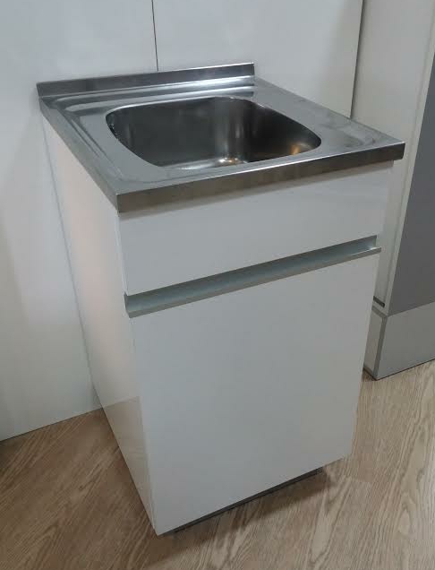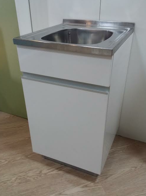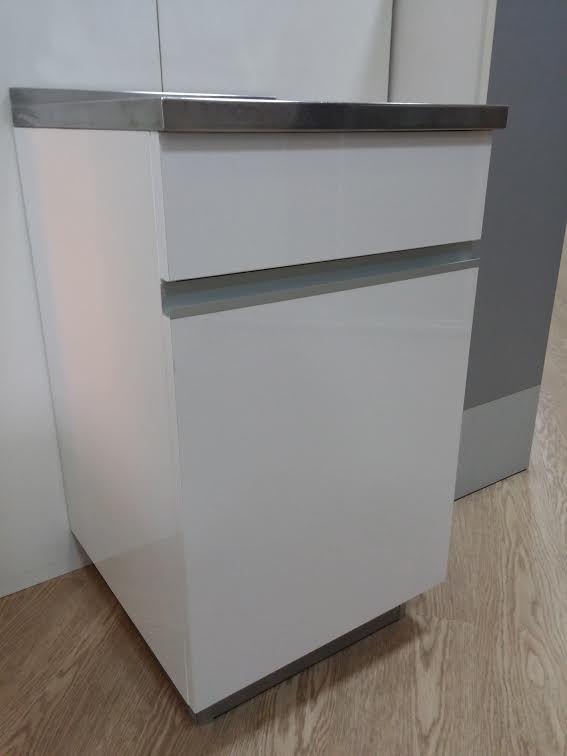 Kuhinjski element po mjeri za nasadni sudoper naručen je prema postojećem sudoperu kada je stranka odlučila zamijeniti postojeći element novim. Kako kuhinjski element sa nasadnim sudoperom stoji odvojen u prostoru sve vanjske strane su od akrila visoki sjaj bijeli (akrilni sloj dobro štiti samu ivericu od utjecaja vlage), dok je unutranji dio iveral bijeli mat. Kako bi vizualno pratili liniju nasadnog sudopera, a istovremeno izbjegli moguće zadržavanje vode na rubu fronte kuhinjskog elementa po mjeri, na frontu smo stavili nasadnu aluminijsku ručkicu. Kuhinjski element ima i svoje podnožje tj. sokl (PVC boje aluminij).