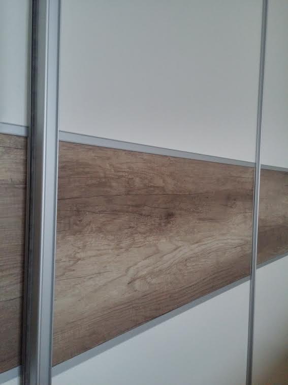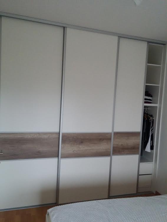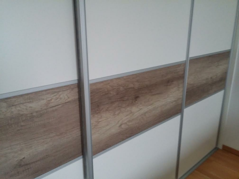 Ugradbeni ormar po mjeri u spavaćoj sobi može se izvesti konstrukcijom vertikala i polica ili elementima sa leđima. Unutrašnjost je podijeljena na kombinaciju visokog vješanja i polica, ladica i polica, te ladica, niskog vješanja i polica. Tom podjelom dobili smo funkcionalni garderobni ormar po mjeri kojeg čine elementi sa leđima od iverala bijeli mat (najpovoljniji). Klizna vrata čine uklade od iverala bijeli mat i iverala hrast Canyon.