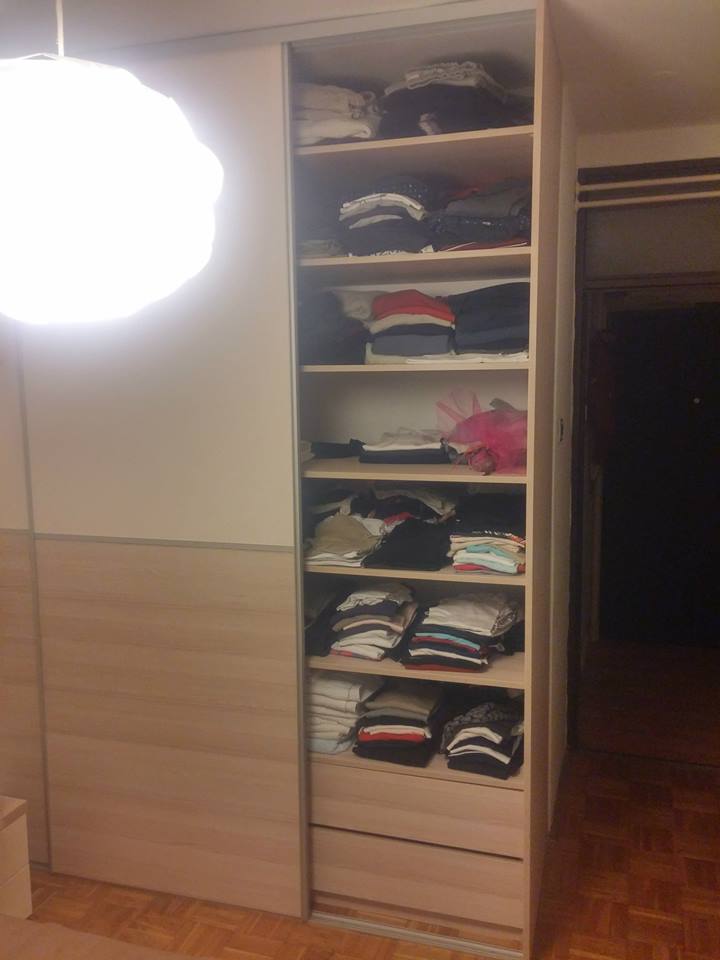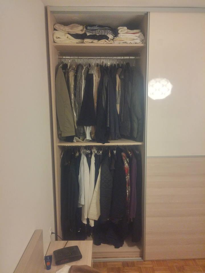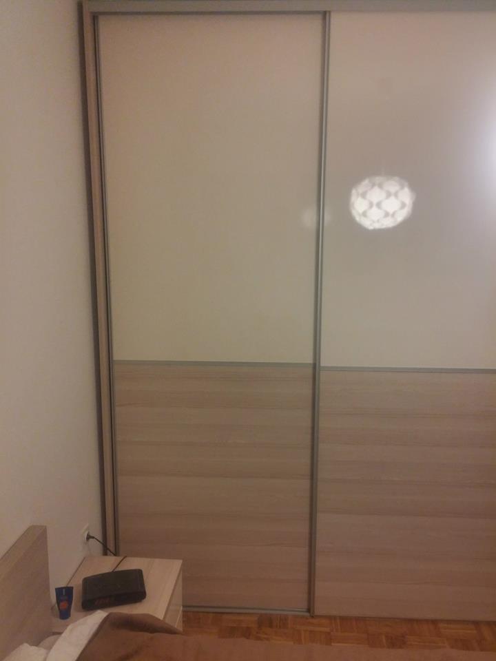 Ugradbeni ormar po mjeri u spavaćoj sobi iskoristio je maksimalno prostor za spremanje garderobe. Kako bi uskladili dekor postojećeg kreveta sa ugradbenim ormarom po mjeri odabrali smo iveral Coimbra. Korpus ormara također smo radili od iverala Coimbra što je garderobni ormar učinilo ekskluzivnijim. Kako bi otvorili prostor spavaće sobe malih dimenzija, a ujedno i otvorili malen prostor, uklade na kliznim vratima kombinirali smo sa iveralom visoki sjaj slonova kost. Unutrašnjost ugradbenog ormara po mjeri u spavaćoj sobi podijeljena je na nisko vješanje u dvije visine, te kombinaciju polica i ladica.