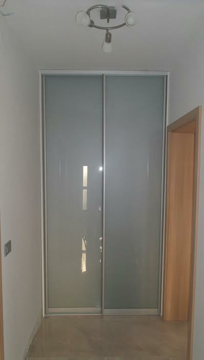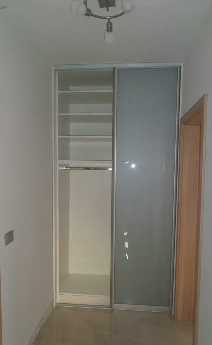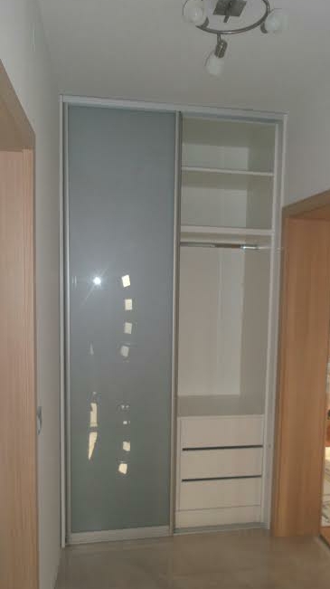 Na ulazu u stambeni prostor velik je hodnik koji jednim dijelom vodi prema dvjema prostorijama. Projektirajući interijer stranka je odlučila na kraju hodnika napraviti nišu za ugradbeni ormar kako bi mogli vizulano sakriti kapute, jakne, obuću i ostalo. Ugradbeni ormar po mjeri sastavljen je od elemenata smještenih između dva zida koje smo maksimalno iskoristili kombinacijom polica, visokog i niskog vješanja, te ladica. Klizna vrata po mjeri zatvaraju ugradbeni ormar od zida do zida, od poda do stropa i time čine veliku staklenu površinu. Uklade kliznih vrata su od stakla lacobel metalic siva koji ističe karakteristike stakla odnosno daje refleksiju i djeluje kao zrcalo, sjaji, a ujedno svojim tonom ističe se u bjelini zidova i sivo - bijelog poda.