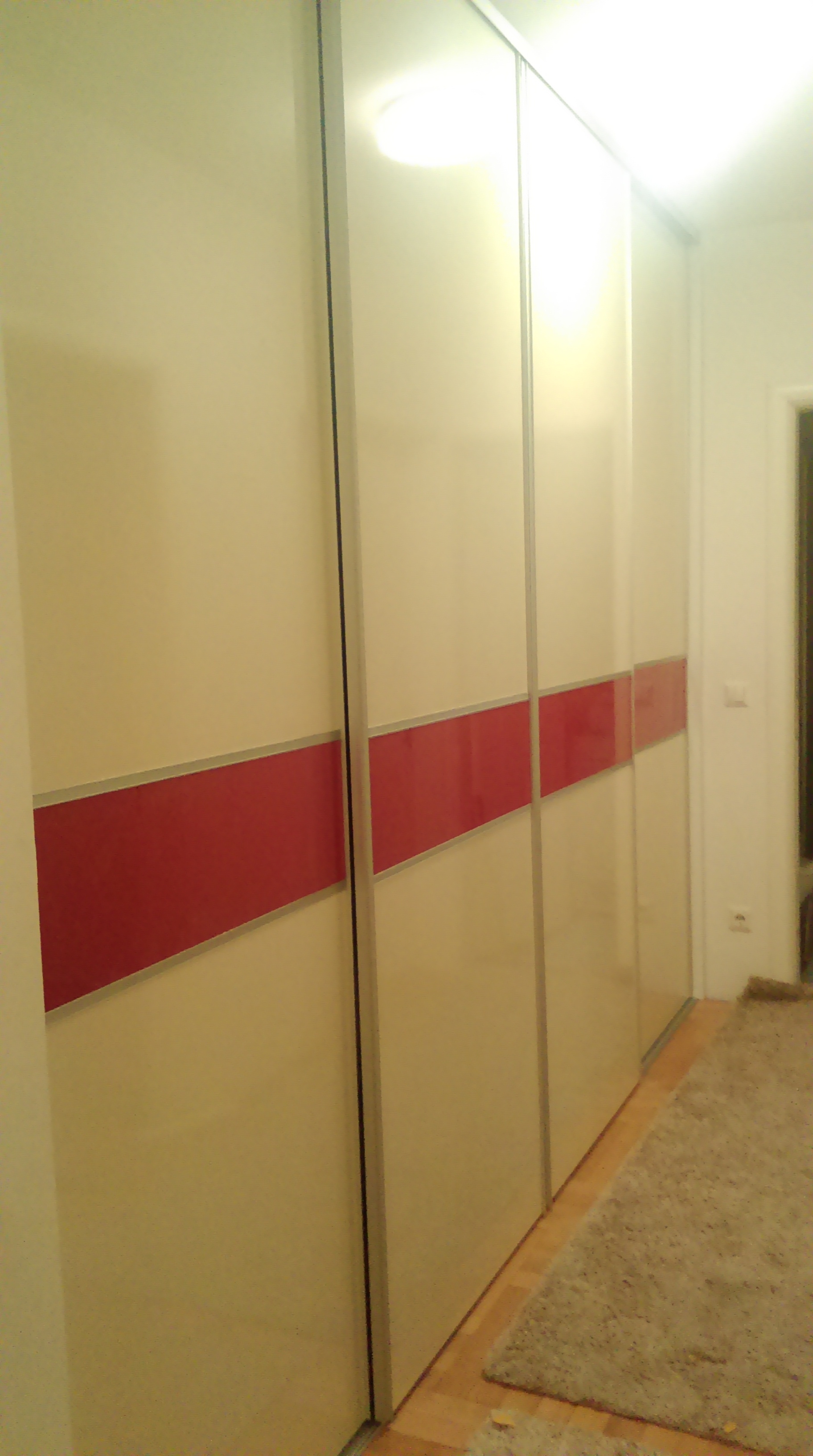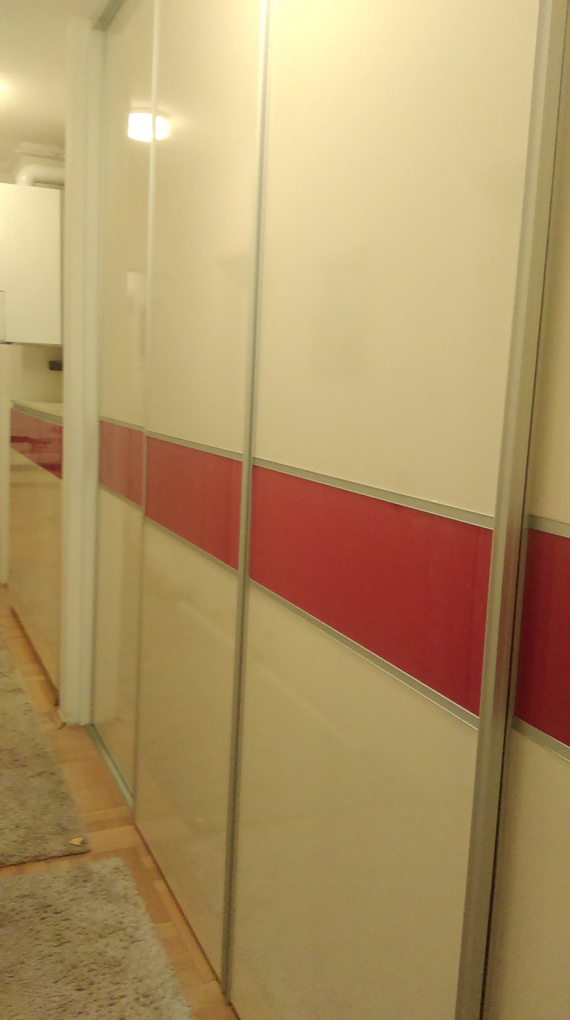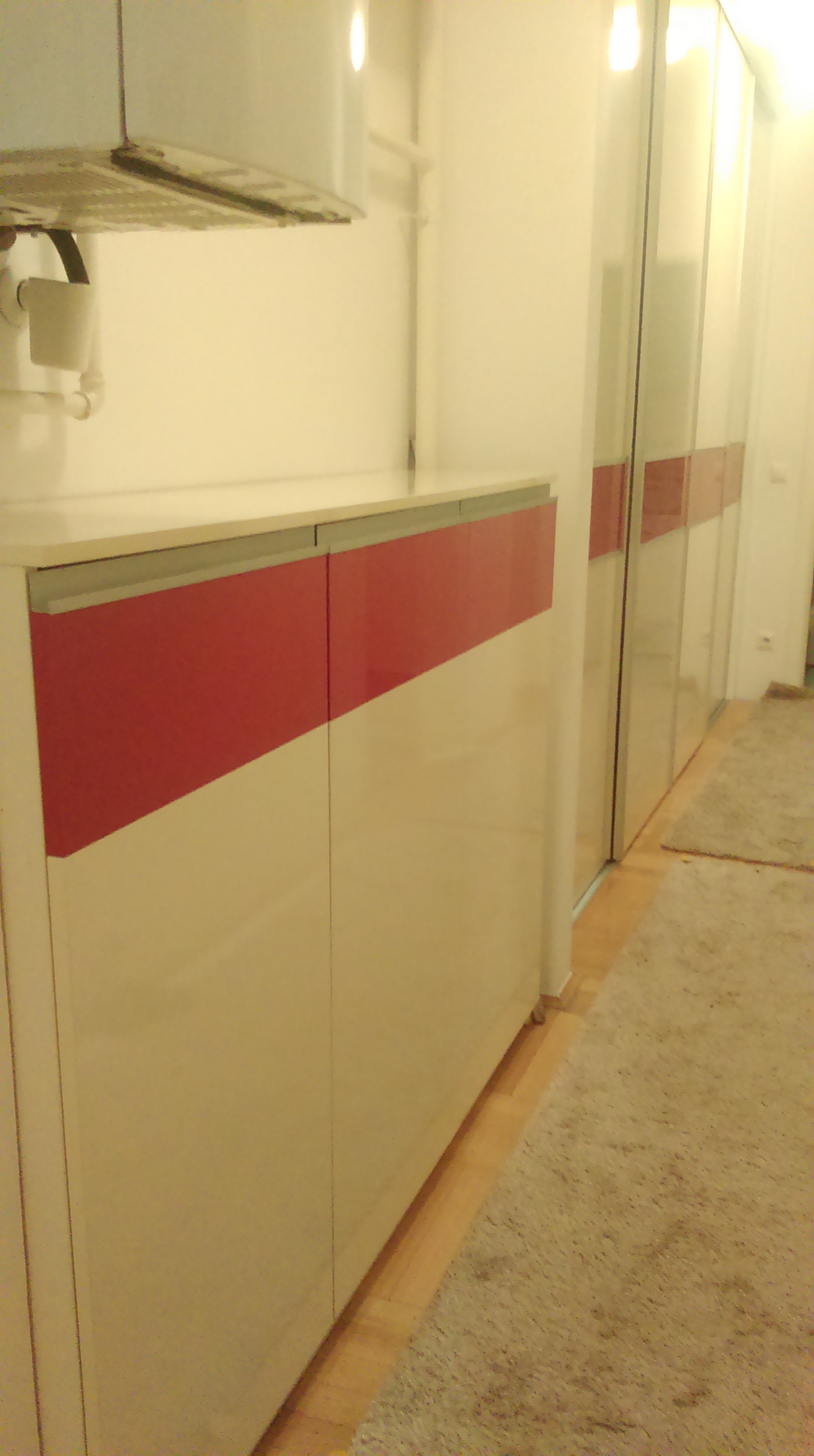 Ugradbeni garderobni ormar po mjeri smješten u hodniku podijeljen je na četiri unutrašnjosti sa kombinacijom vješanja, polica i ladica. Pravilan raspored elemenata unutrašnjosti ormara čini ormar po mjeri funkcionalnim, a klizna vrata estetski važnim dijelom interijera. Klizna vrata čine uklade od iverala visoki sjaj slonova kost (Avorio) i acryl visoki sjaj crvena. U istom hodniku dodali smo i ormarić za cipele po mjeri. Fronte komode po mjeri smo radili prateći izgled kliznih vrata stoga smo spojili po visini dva različita dekora i postavili nasadnu aluminijsku ručkicu koja prati liniju horizontalnog profila na kliznim vratima.