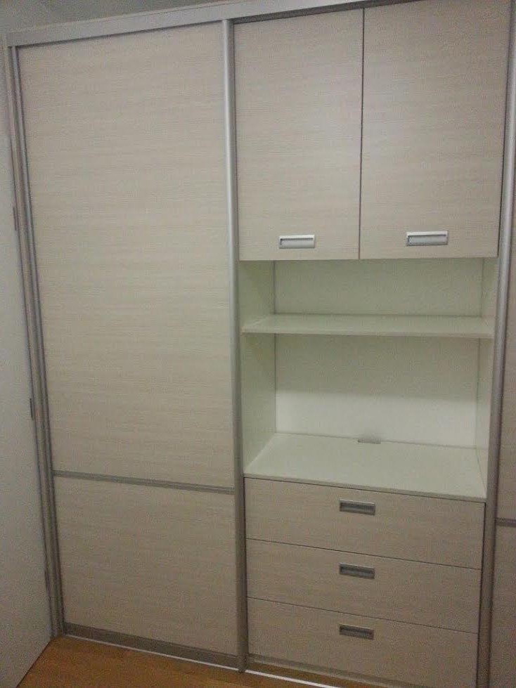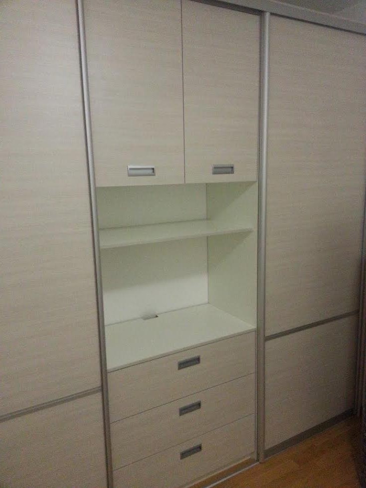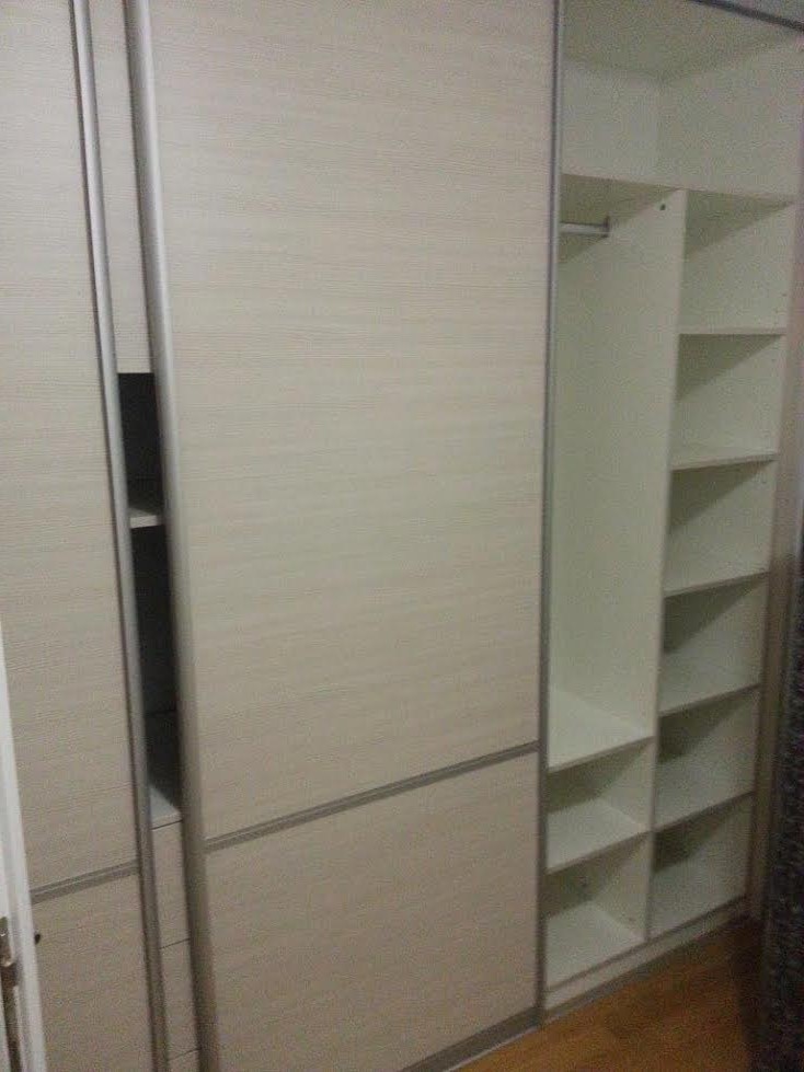 Ugradbeni garderobni ormar po mjeri u spavaćoj sobi sa otvorenim središnjim dijelom za tv jedinicu. Vodilica za klizna vrata je jednostruka, a na frontama otvorenog dijela stavili smo ukopne ručkice kako bi izbjegli smanjivanje dubine tih elemenata.