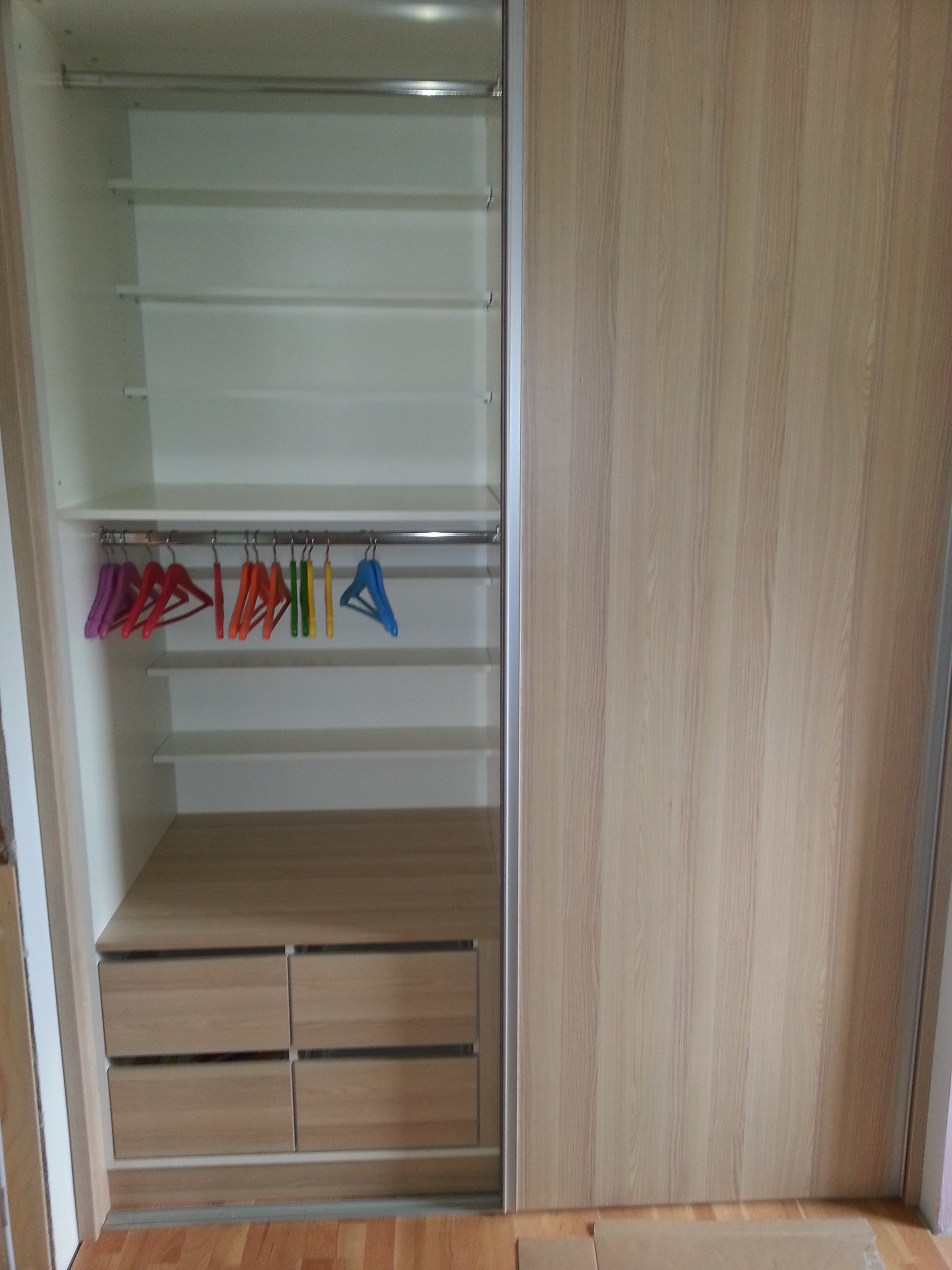 Ugradbeni ormar po mjeri, sa kliznim vratima sve češće projektiramo za dječje sobe zbog boljeg iskorištenja prostora i funkcionalnosti. Drvni dekor daje toplinu prostoru, a u kombinaciji sa visokim sjajem ormar će biti lijep i u tinejdžerskoj dobi.