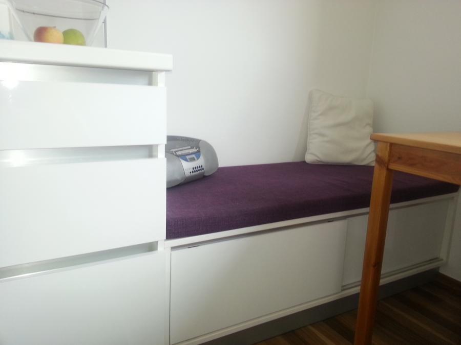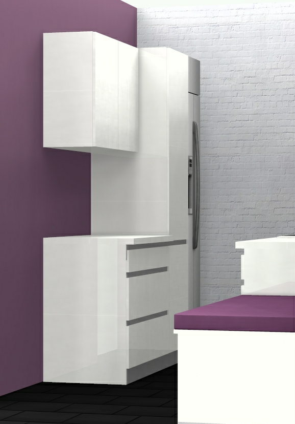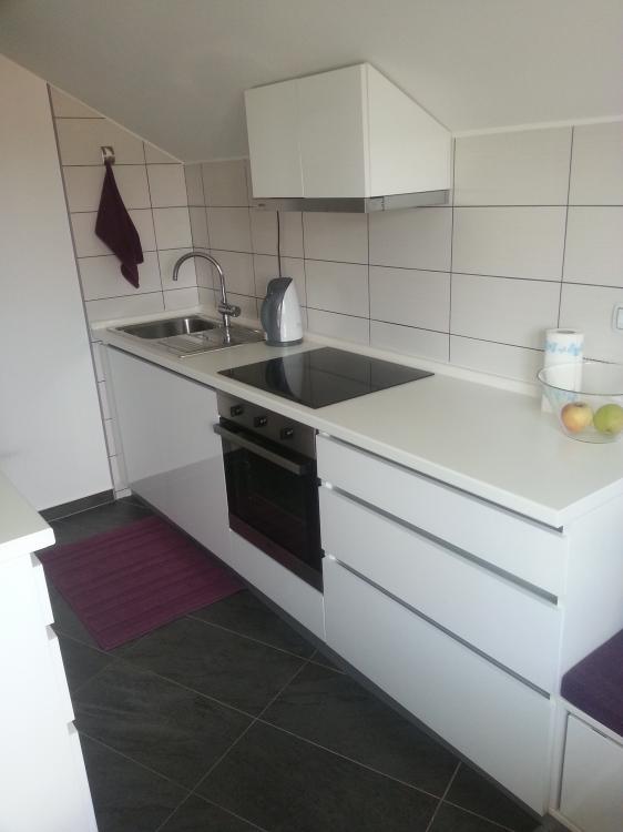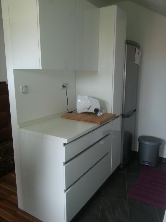 Kuhinja je izrađena po mjeri od iverala bijeli visoki sjaj, te radne ploče bijeli visoki sjaj. Osim elementa za sudoper, ugradbene perilice za suđe i elementa za pećnicu, sastoji se od jednog visokog elementa, dva elementa sa samouvlačnim ladicama, te jednog gornjeg elementa. Napa je također ugrađena u element izrađen prema postojećoj kosini stropa. U nastavku kuhinje je element sa kliznim vratima koji ima funkciju klupe, te je dio blagovane. Prostor je malih dimenzija, ali maksimalno iskorišten s obzirom na već postavljene instalacije prije razrade ideje o izgledu kuhinje.