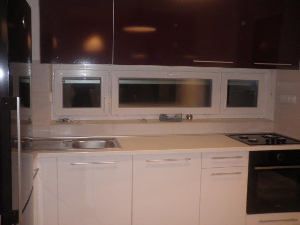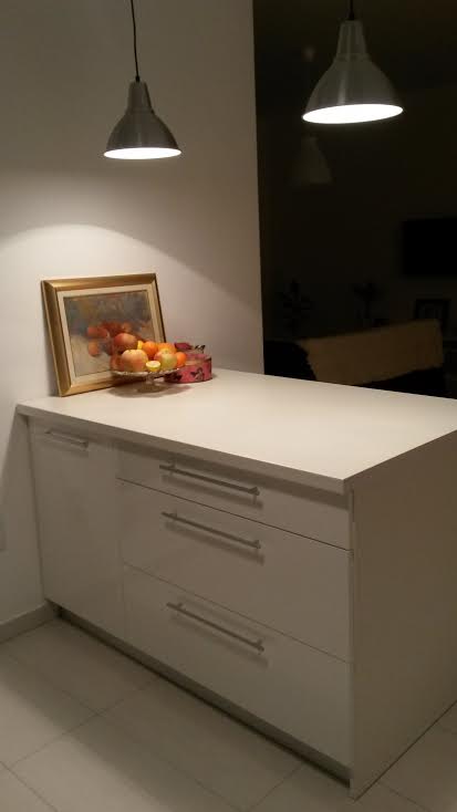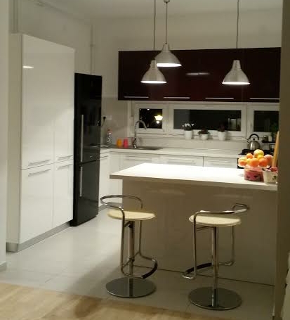 Kuhinja u "L", u kombinaciji iverala visokog sjaja bijelog i orhidejom (patliđan) sa bijelom mat radnom pločom. Kuhinju ćine kuhinjski elementi donji: element za pećnicu, element sa samouvlačnom ladicom i policom, ugradbena prilica suđa, element za sudoper, kutni kuhinjski element, te dva visoka elementa. U širem visokom elementu sakriven je bojler. Gornji elementi su klasični sa policama i zaokretnim vratima. Otok/šank ćini element sa policom i element sa samouvlačnim ladicama.
