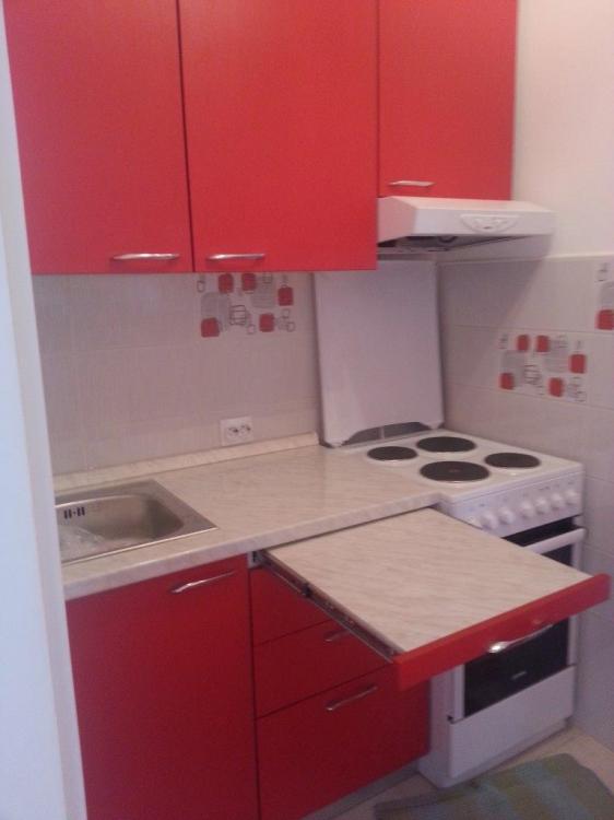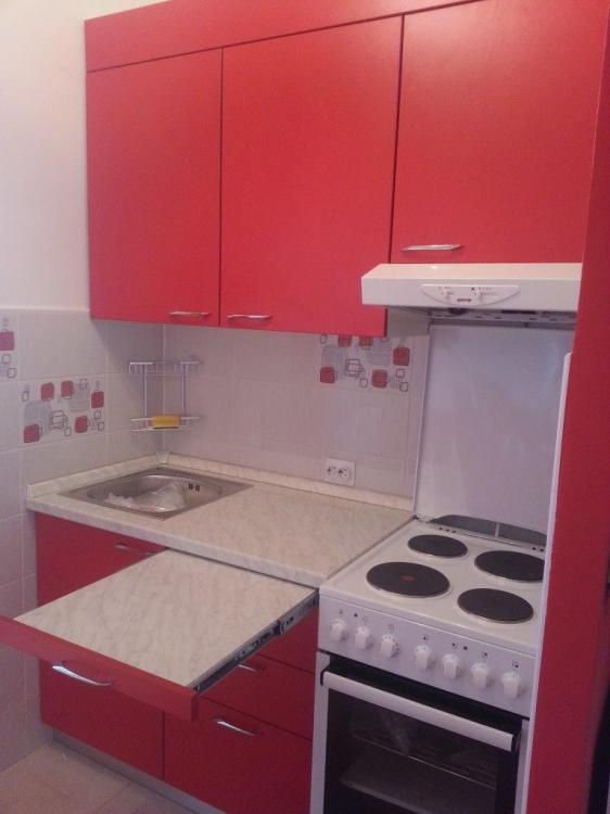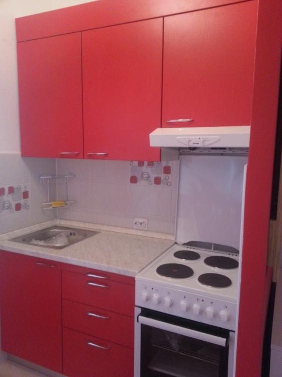Kuhinja po mjeri sastoji se od elementa za sudoper i elementa sa ladicama, dva gornja elementa i elementa za kuhinjsku napu. Iznad gornjih elemenata je maska koja skriva cijev za napu. Fronte kuhinjskih elemenata izrađene od iverala intenzivne crvene mat boje osvježavaju mali kutak predviđen za kuhinju. Radna ploča je dekor carrara sjaj, imitacija bijelog mramora. Zbog male radne površine dodali smo dio radne ploče u element sa ladicama koja se prema potrebi izvuče. Lijep detalj na jednobojnoj kuhinji su elegantne metalne sjajne ručkice.