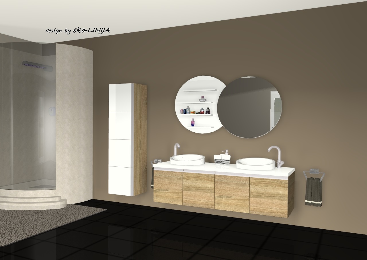Kupaonski namještaj Alderan sastoji se od nekoliko elemenata. Donji element za umivaonik čine ormarići sa profilnim ručkicama. Na ormariće se postavlja ploča debljine 36 mm, ili kuhinjska radna ploča. Iznad umivaonika postavljena je otvorena polica i ogledalo. Police su različitih dubina od najniže prema gore dubine su 100, 90, 80 i 70 mm. Viseći element podijeljen je po visini na četiri dijela, otvara se pomoću profilnih ručkica postavljenih vertikalno na vrata ormarića. Ovisno o prostoru u koji planirate smjestiti kupaonski namještaj, možete staviti jedan ili više ormarića. Za dodatni efekt može se ugraditi led rasvjeta i time dodati poseban efekt. U ponudi imamo velik izbor boja i tekstura iverala, visoki sjaj, te staklo u boji, pa možete osmisliti svoj Alderan.