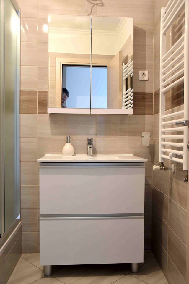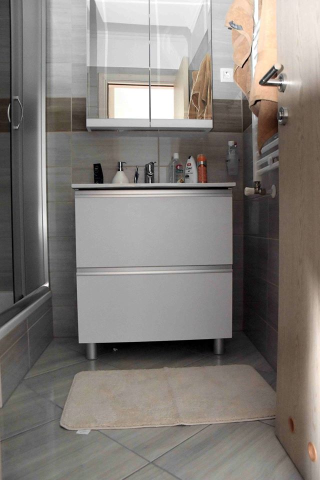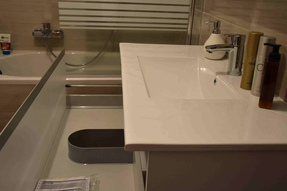 Element za nasadni umivaonik ima dvije samouvlačne ladice u koje se mogu spremiti sredstva za čišćenje, deterdženti ili ručnici. Kako bi element s ručkicama bio u jednoj ravnini postavili smo aluminijske nasadne ručkice po cijeloj širini fronte koje su ujedno i zaštita fronte od zaostajale vode.