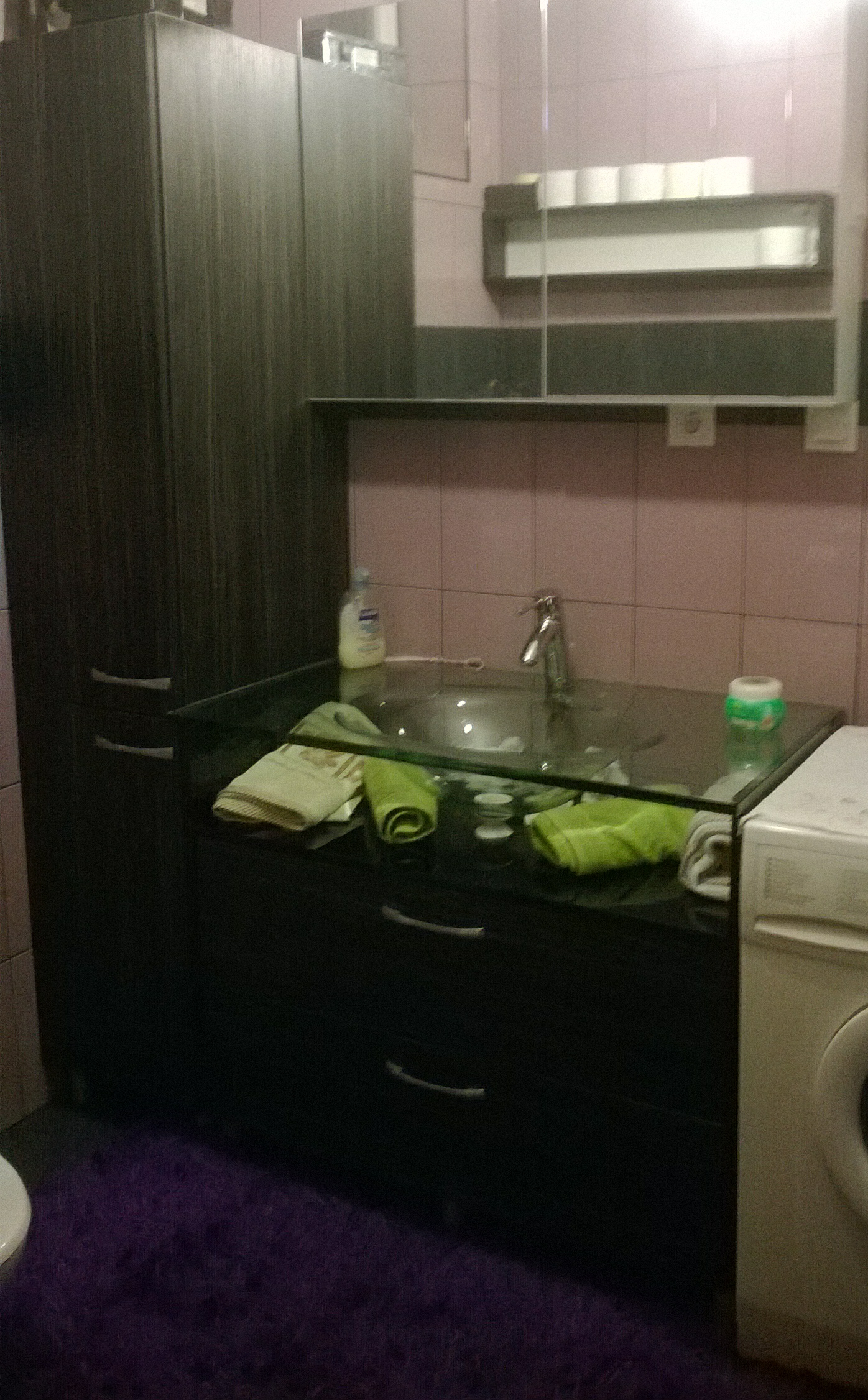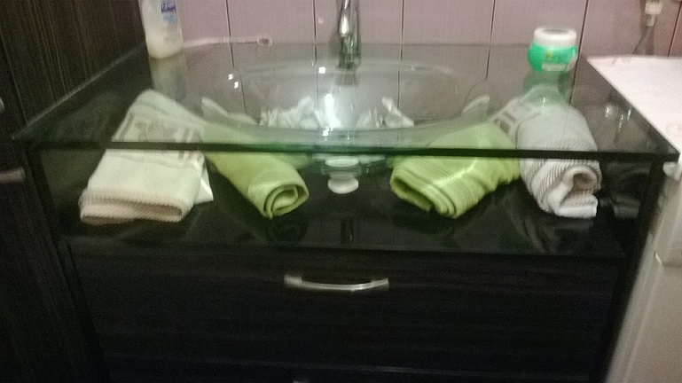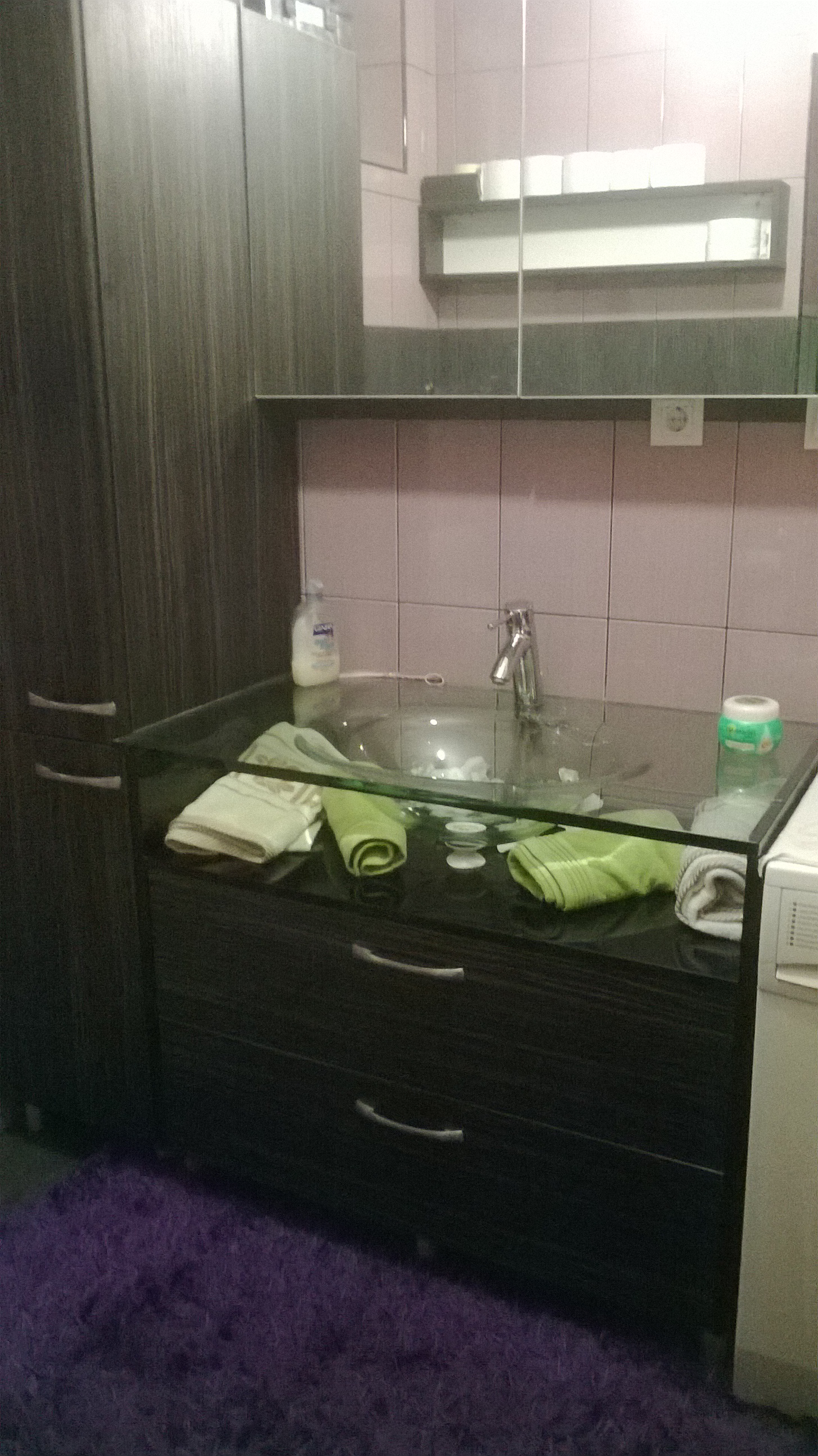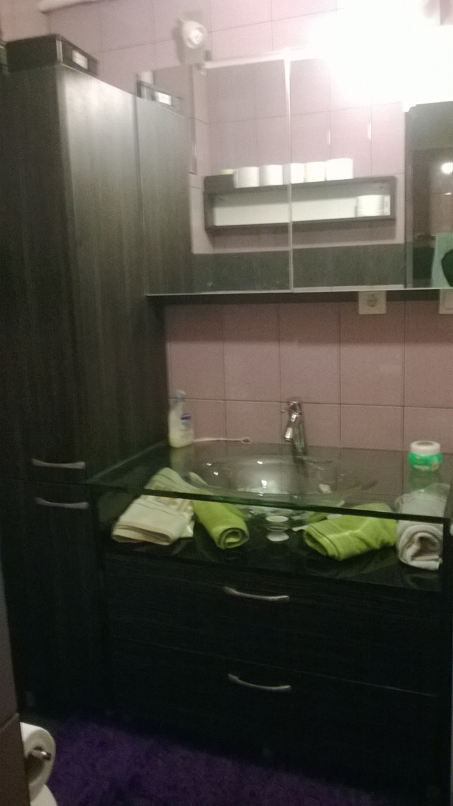 Kupaonski blok izrađen prema željama kupca, uz nekoliko naših savjeta, sastoji se od visokog elementa sa policama, elementa za umivaonik sa samouvlačnim ladicama, visećeg elementa sa ogledalom i visećeg elementa koji je postavljen kao otvorena polica. Element za stakleni umivaonik osmišljen je kako bi što bolje naglasili sam umivaonik i istovremeno iskoristili njegovu transparentnost. Materijal od kojeg su izrađeni kupaonski elementi su vlagootporni iveral drvni dekor ebanovina i visoki sjaj acryl crni.