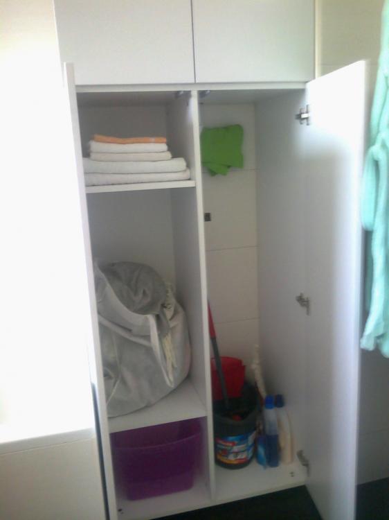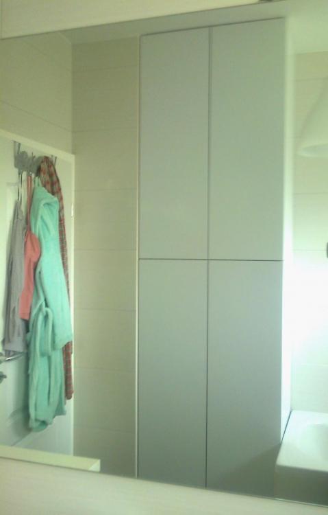 Ugradbeni ormar po mjeri u kupaonici od vlagootpornog iverala odlično je mjesto za spremanje prljavog rublja, sredstava za čišćenje i svega potrebnog u kupaonici, a ujedno je sakrio bojler. Tako je kupaonica elegantna i bez nepoželjnih detalja.